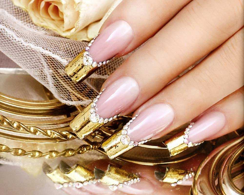 Дизайн ногтей для леди: золотой френч с декором в виде жемчужных камней