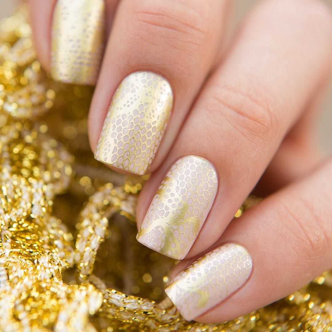 С золотым цветом одинаково сочетаются как матовые лаки, так и глянцевое покрытие. Не обязательно для придания своему маникюру позолоты использовать лаки. С декором отлично справятся блески золотистого цвета, стемпинг, фольга, пленка. Они придадут особый шарм даже самому скромному дизайну.