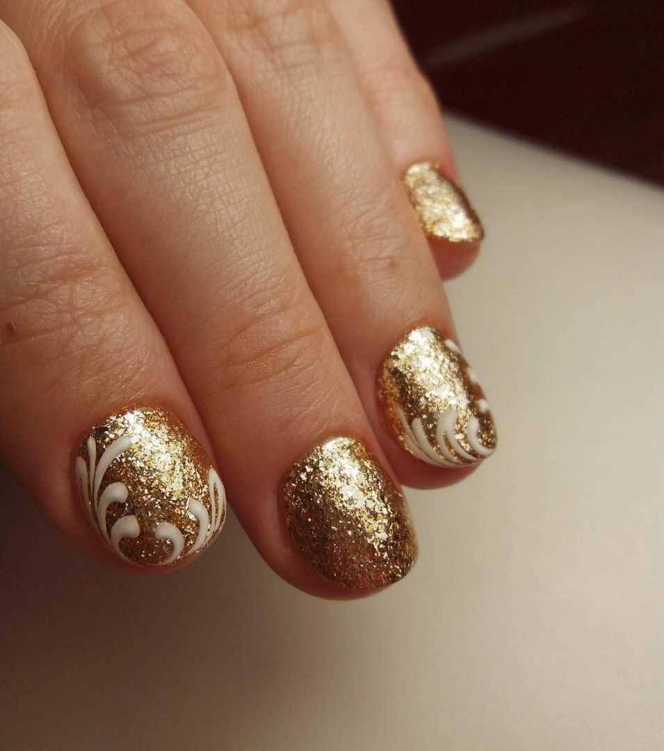 Короткие ногти отлично смотрятся практически в любой технике и расцветке. Итак, если вы решили сделать золотой маникюр на короткой ногтевой пластине, можно назвать его однотонным нейл-артом, который можно умело проредить золотыми узорами, а можно украсить изящный нейл-арт теркой, золотыми стразами или фольгой.