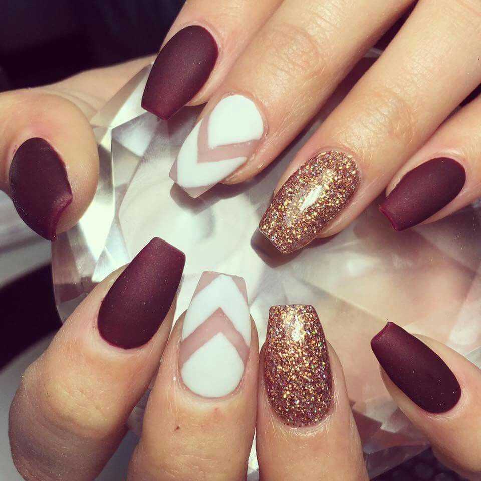 Сделать маникюр более праздничным поможет матовый топ (финишное покрытие). Совершенство бордового цвета полностью раскрывается не в глянцевой текстуре, а именно в матовой. Но чем же украсить такой дизайн? Отлично смотрится однотонное матовое покрытие и небольшое количество страз. Блеск камней будет элегантно выделяться на неброской поверхности ногтя. Стразы и бульонки лучше выбрать золотого цвета. Однотонное бордовое покрытие подходит как самостоятельная основа под дизайн. Такие ногти можно украсить золотистыми лунками, которые должны быть глянцевыми, чтобы блеск не терял свое очарование.