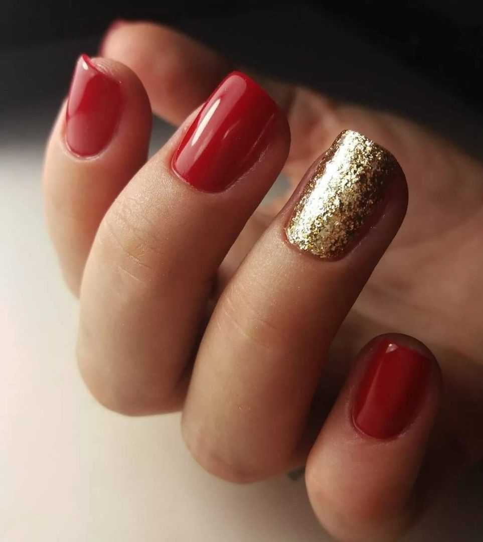 Дорого и по тематике вечера будет смотреться новогодний красно-зеленый маникюр с золотом. На коротких ногтях нужно быть острожным с декором. Хорошо выглядят вертикальные узоры. Они визуально удлиняют пальцы. Как вариант, за основу можно взять красный цвет, зеленым лаком прокрасить треугольную лунку через весь ноготь, а ее края обвести золотистым.