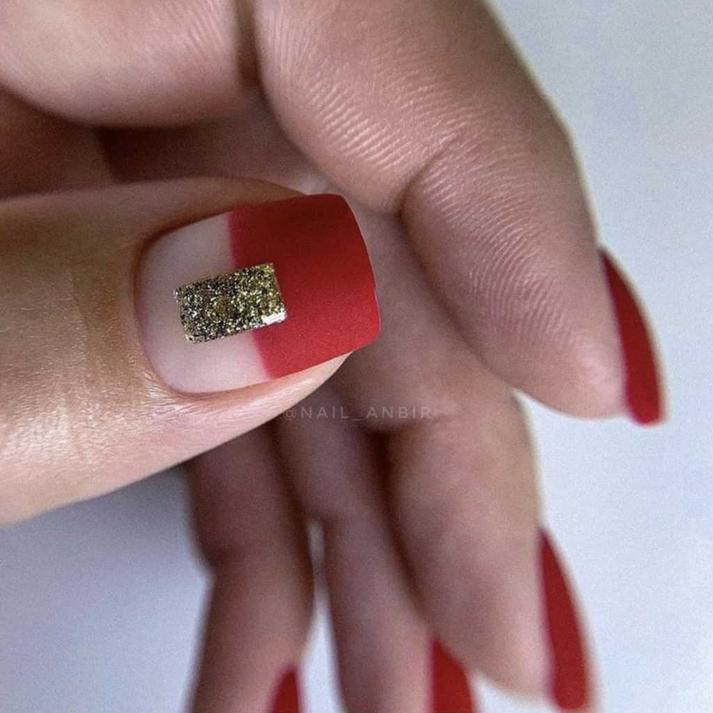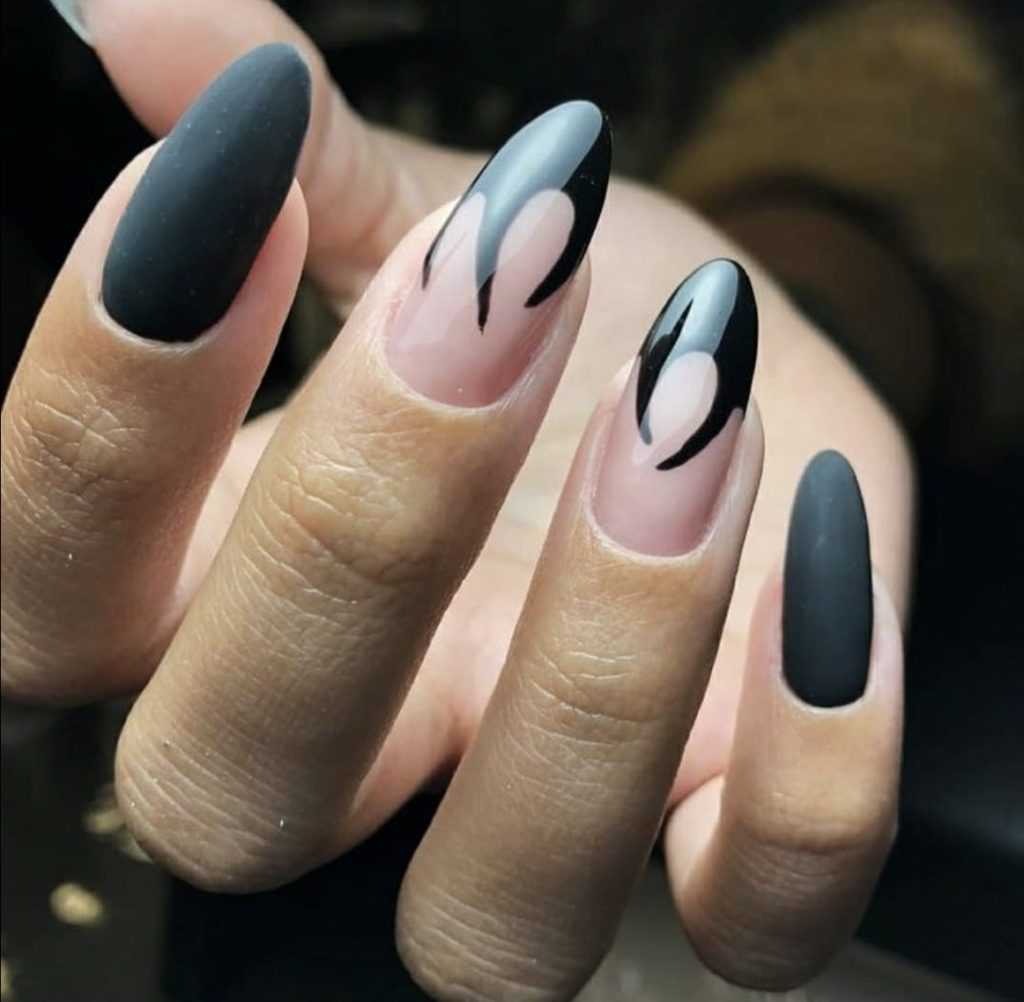 - матовые. Кончики ногтевой пластины оставляют глянцевой, зато всё основание ногтя покрывается матовым шеллаком;