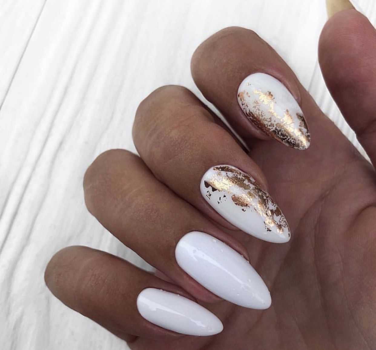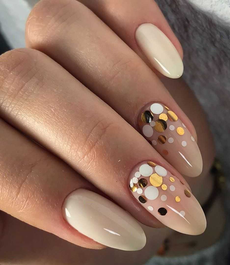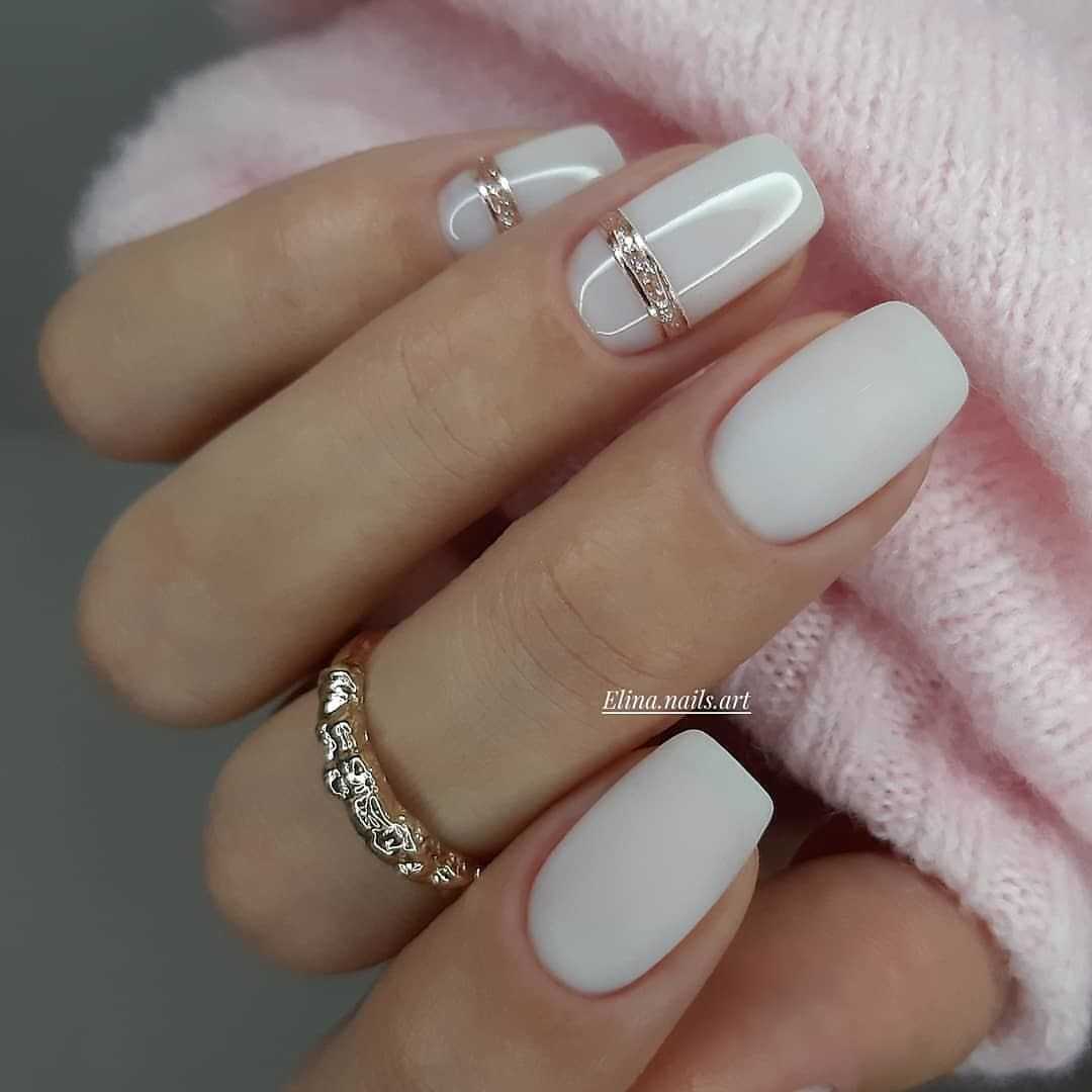 Молочный цвет в зависимости от освещения может иметь определенные цветовые нюансы. Это свойство молочного цвета можно выигрышно обыграть в паре с золотым декором. Золотые элементы в дизайне ногтей всегда смотрятся эффектно, поэтому не стоит ими пренебрегать, если вы хотите добиться стильного и заметного дизайна ногтей.