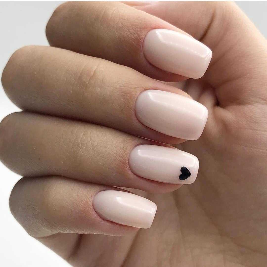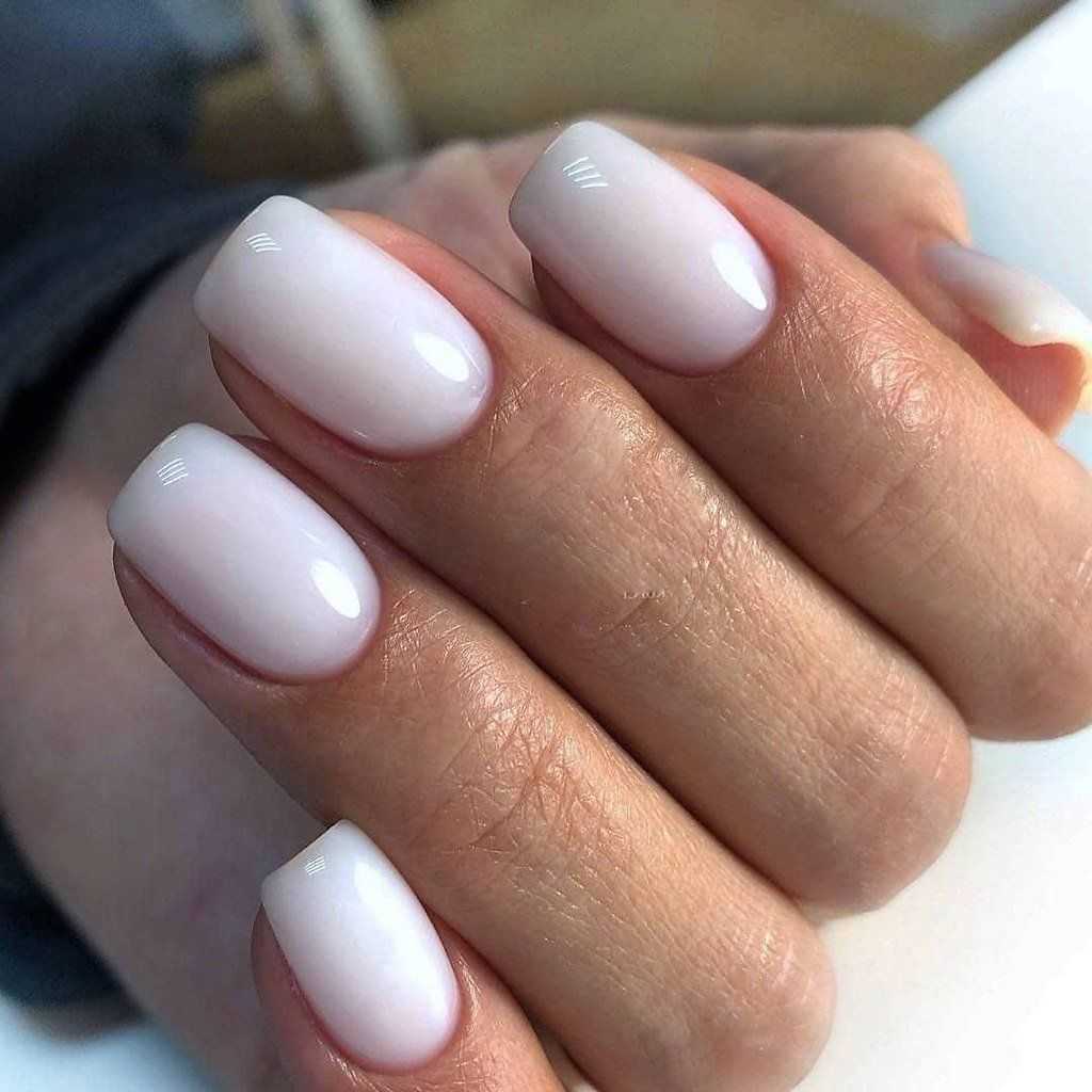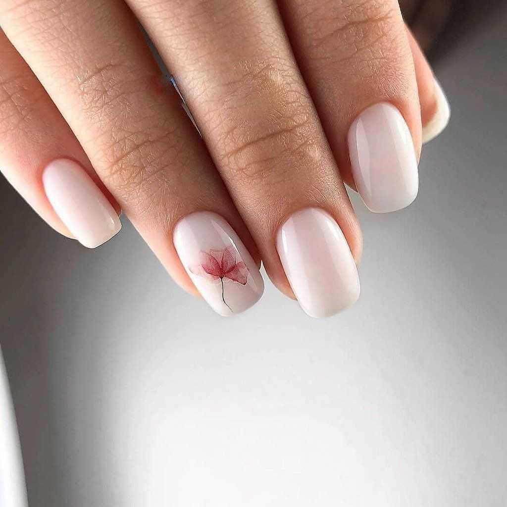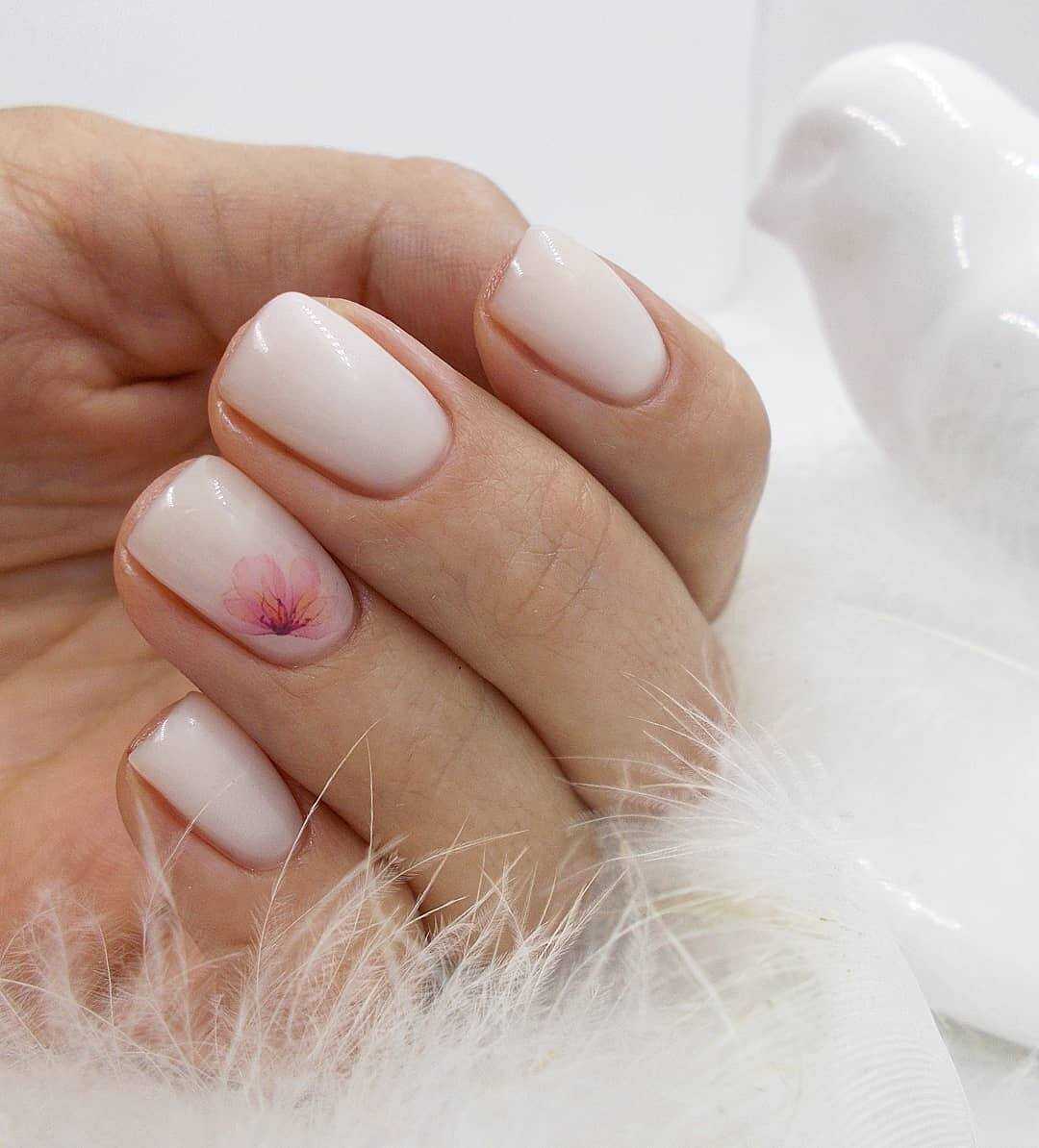 Маникюр молочный с дизайном на короткие ногти квадратной формы легко выполнить в домашних условиях. Базу нужно наносить в несколько слоев.
