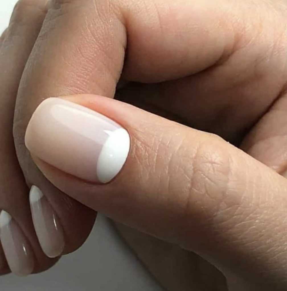 Отличительная черта тонкая белая полоска на кончике ногтя. Выполняется в телесной гамме, таких как телесный, бледно-розовый и персиковый. Линии маникюра плавные, что делает его универсальным практически для любых форм ногтей.