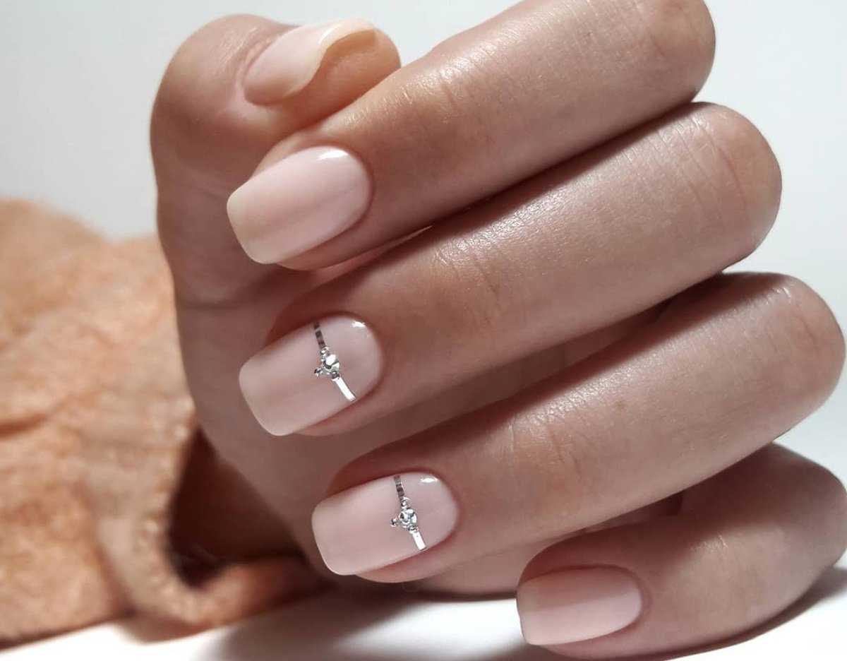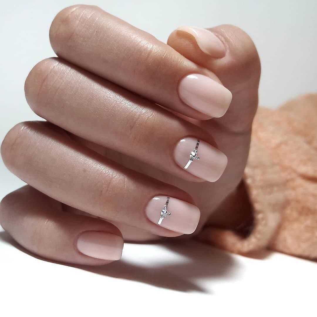 Отсутствие ярких страз, акцентов и камней. Основу составляет прозрачная и бежевая база, а также тонкие линии и прорисовка лунок.