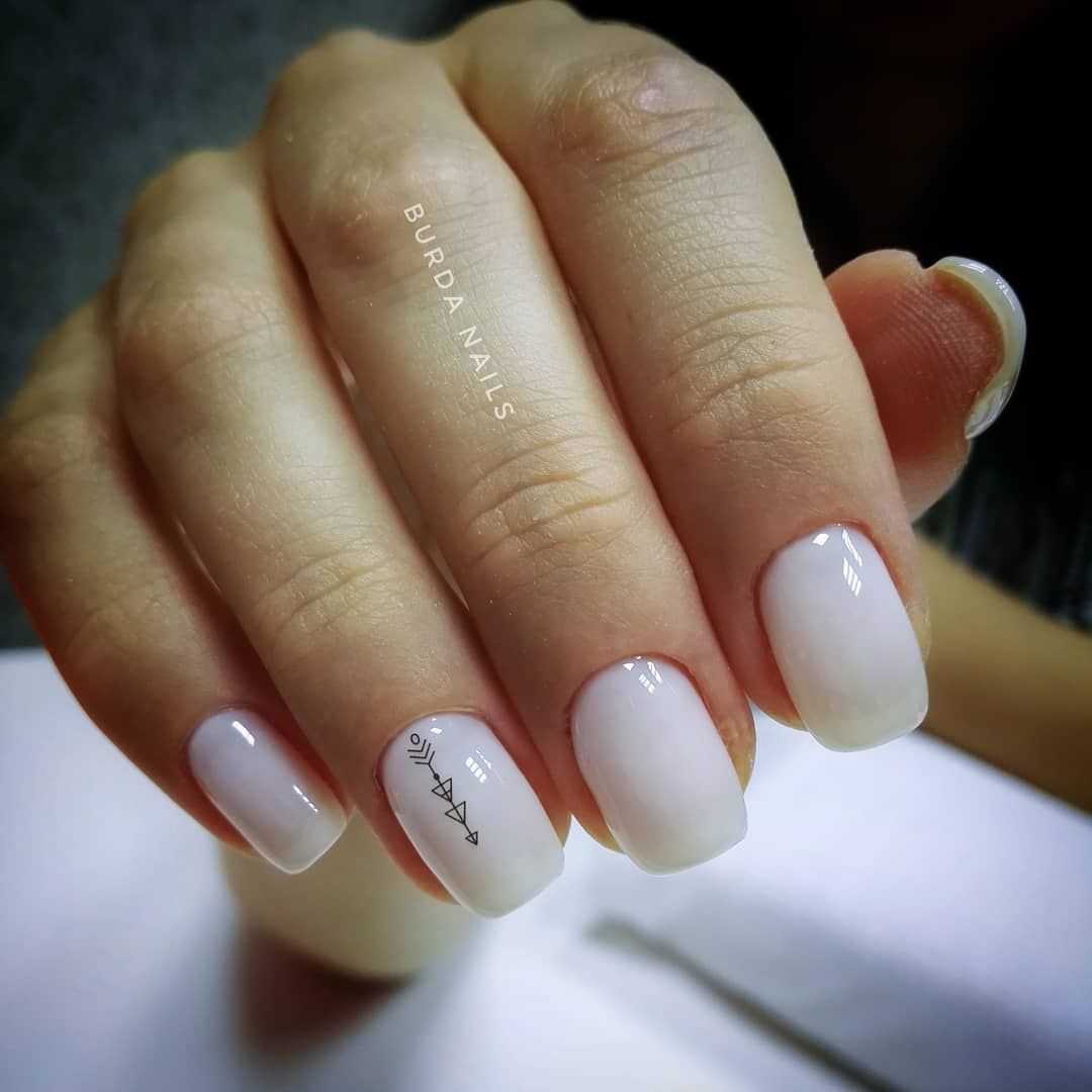Бело-молочные оттенки настолько притягательны и самодостаточны, что для создания красивого, легкого дизайна хватает одного лака. Его наносят в несколько слоев, просушивают. Покрытие может иметь глянцевую или матовую фактуру, легкий градиент в одной тональности.