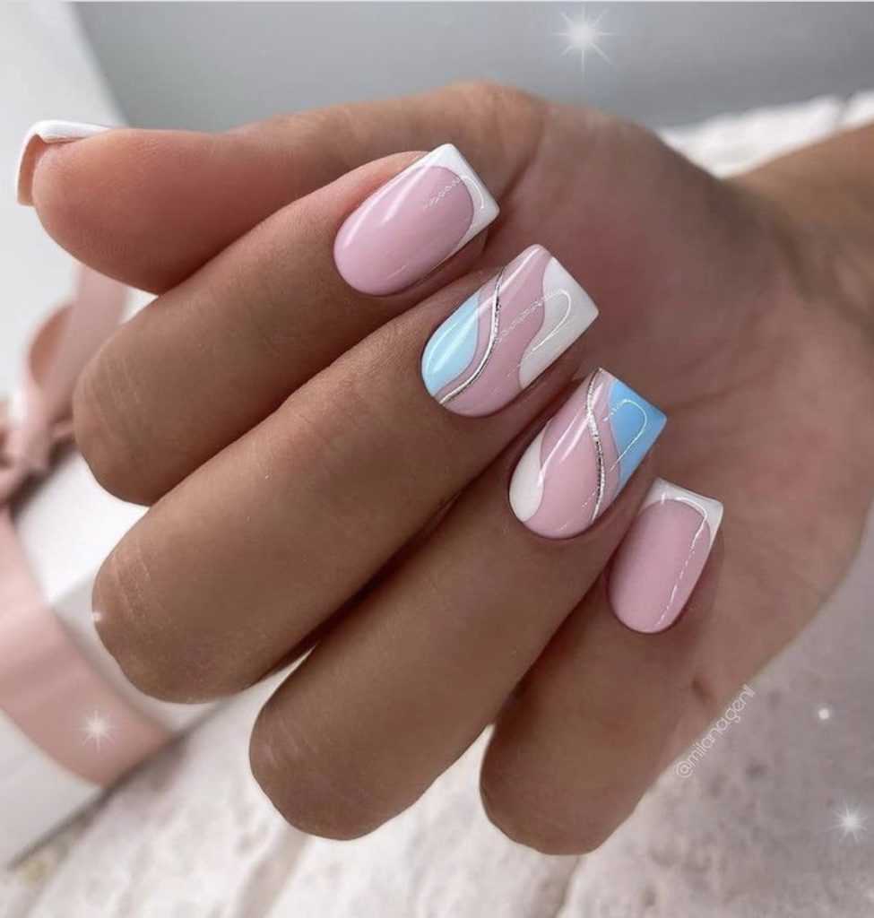 Из названия понятно, что это стильный вид французского маникюра отличается разнообразием геометрических фигур и линий. Характерным является совмещение нежных с яркими цветовыми гаммами и выделение нескольких пальцев. Применения тонкой кисти и краски поможет прорисовать детали тщательнее.