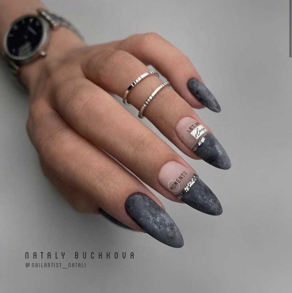 Выполнить маникюр с фольгой можно как на глянцевом, так и на матовом фоне. На любом покрытии оттиск фольгой будет смотреться сдержанно и стильно. При желании дополните маникюр серебряным глиттером на одном из пальцев, например, на мизинце.