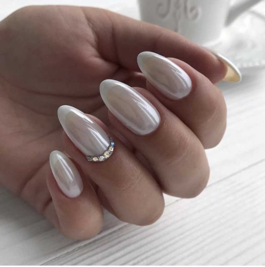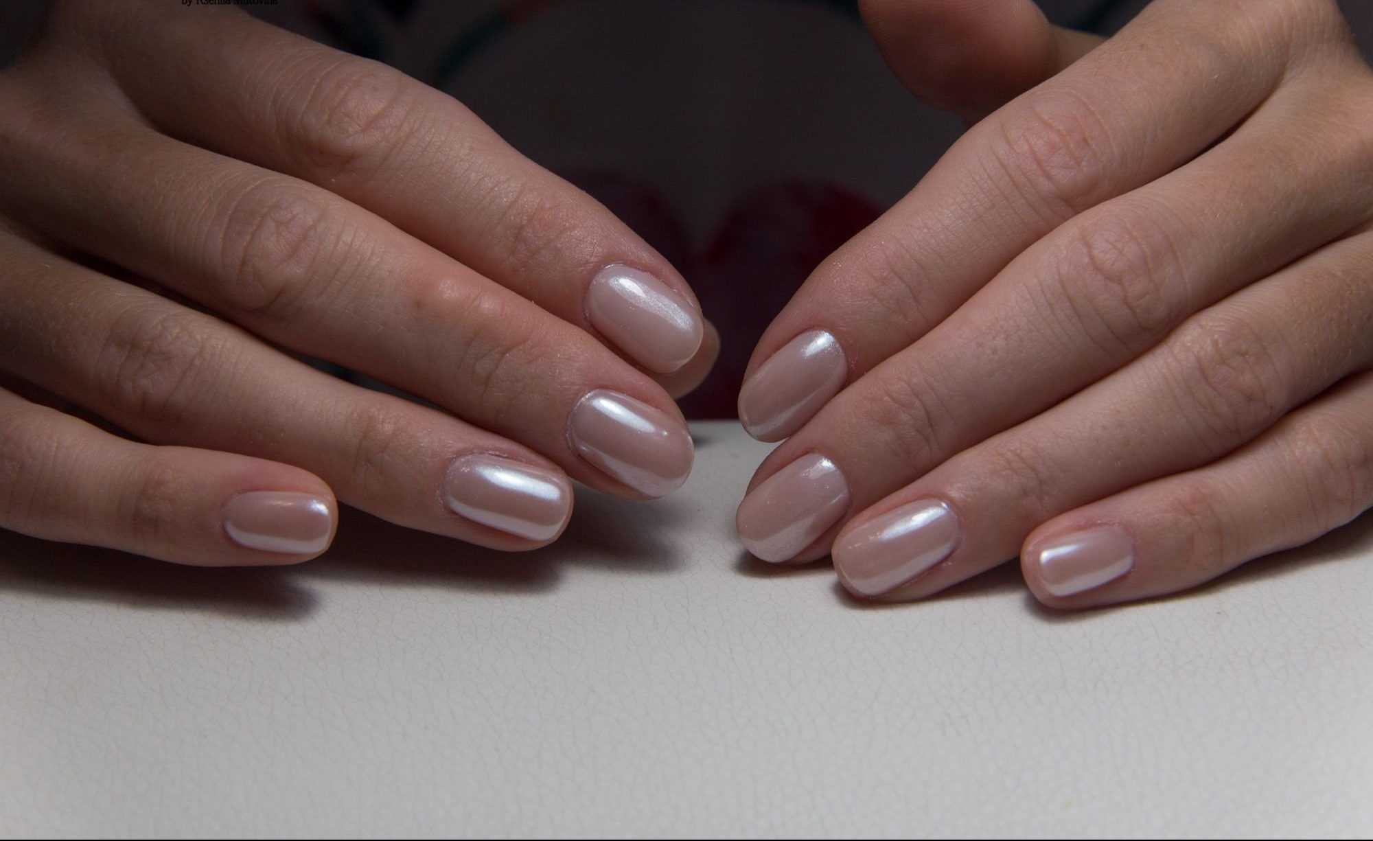 Для создания зеркального или сверкающего эффекта берут жемчужную втирку. На молочных ногтях эффектно смотрится радужный, розовый, серебряный и золотой пигмент. Зеркальный декор часто делают только на 1-2 пальчиках. Эта техника применима к любой длине, маникюр с втиркой красиво воспринимается на ногтевых пластинах любой формы, включая квадрат и миндаль. Допускается дополнить маникюр с втиркой росписью, слайдерами, стразами, стемпингом. При желании ранее сделанное нюдово-камуфлирующее покрытие всегда можно в дальнейшем освежить жемчужной втиркой или глиттером, сменить матовую версию на зеркальную.