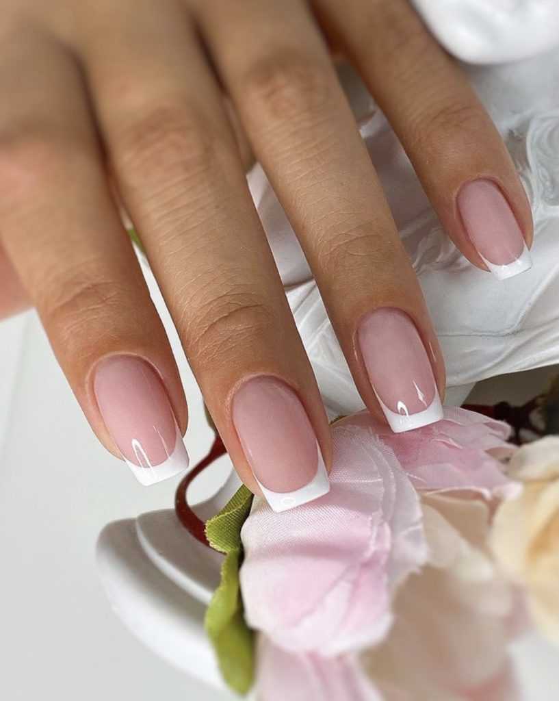Французский маникюр на квадратных ногтях должен оптически сглаживать их угловатость;