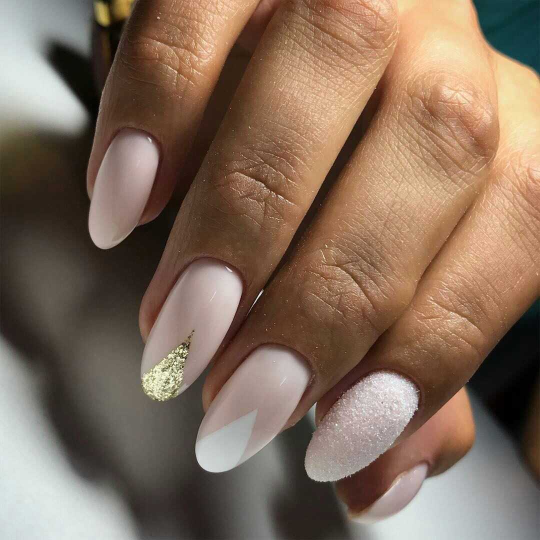 Стильно смотрится однотонный молочный маникюр, в котором один из ноготков выделен золотым глиттером. В молочном маникюре можно смело экспериментировать с узорами и кружевом в золотом цвете. Молочный цвет достаточно нейтральный, поэтому вы не переборщите даже если украсите декором более 2 ноготков на руке.