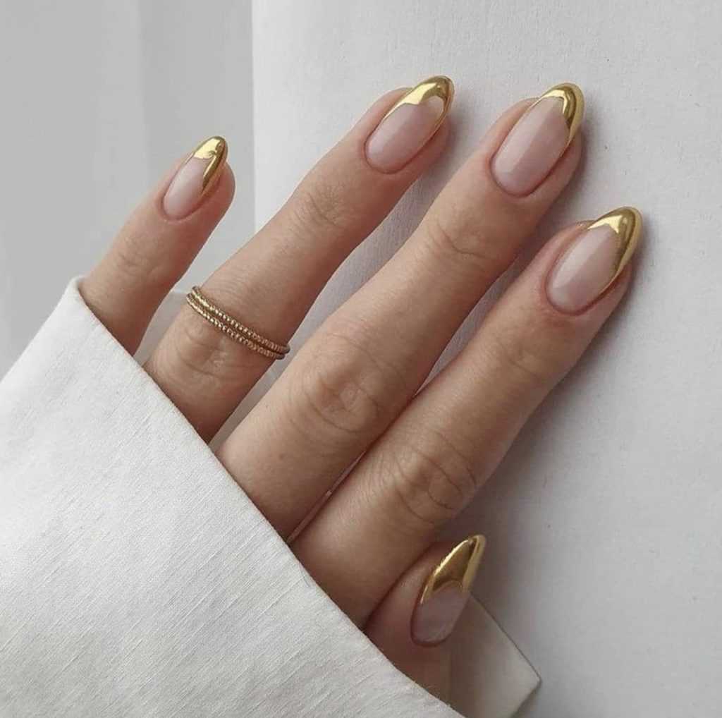 - Праздничный френч 2023 с черной основой и золотым (лак, фольга) свободным крем ногтя. Любая матовая основа и краешек цвета «хромированный металлик». Это сочетание выбирают и для ногтевого пирсинга, любительницам всего экстравагантного.