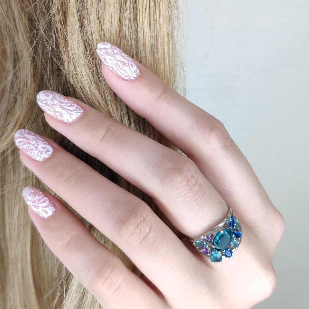 Данный вид дизайна может быть разнообразным, потому что типы материала самые разнообразные. Различаются орнаментом, мотивом и узором. Кружево будет отлично смотреться не только на одном пальце, но и на всех. Большинство барышень любят наносить кружево на весь ноготь и украшать стразами.