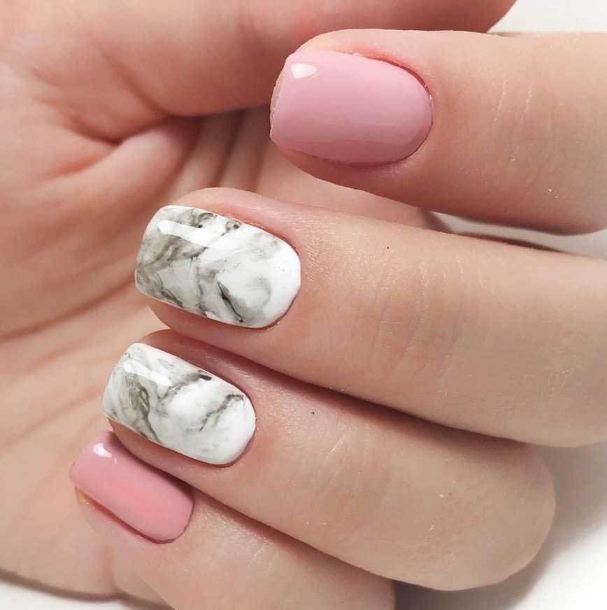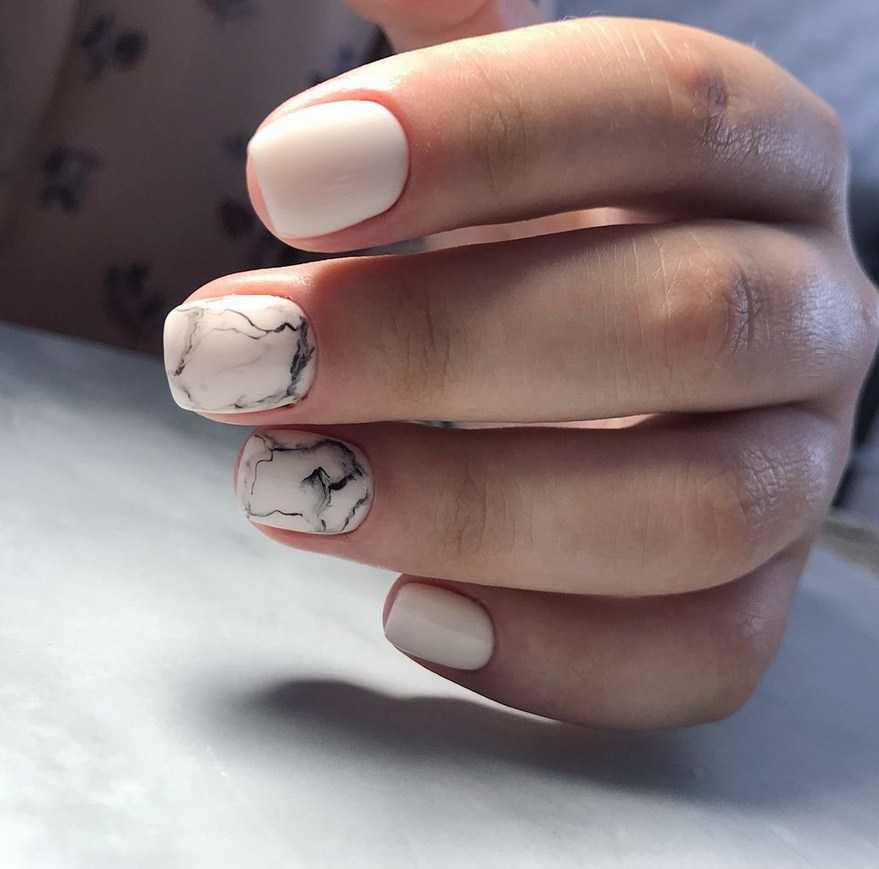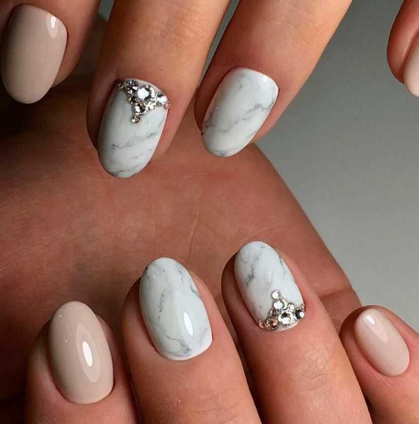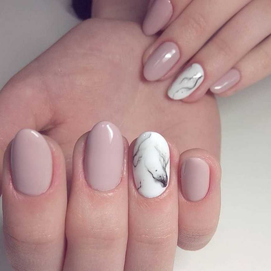 Маникюр мрамор прекрасно смотрится на коротких ногтевых пластинах. На фото особенно великолепно выглядят светлые, нюдовые, пастельные оттенки, которые близки к природным текстурам мрамора. Декор лучше применять в небольшом количестве, чтобы не перегрузить дизайн.