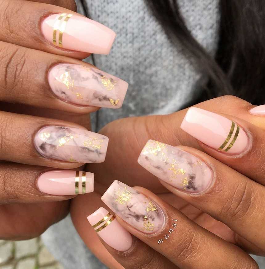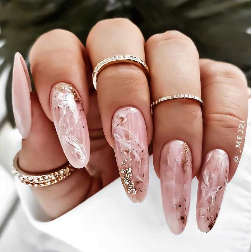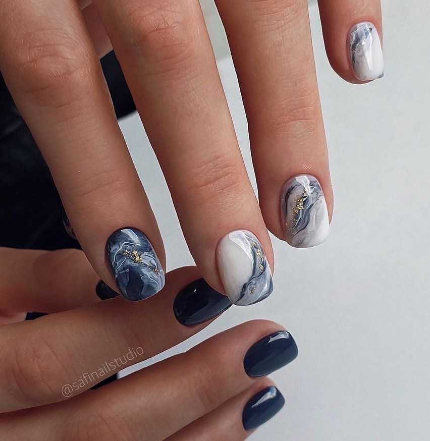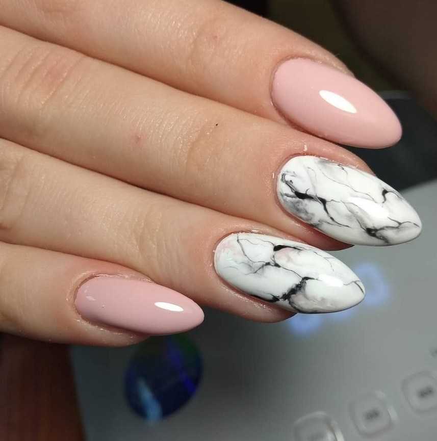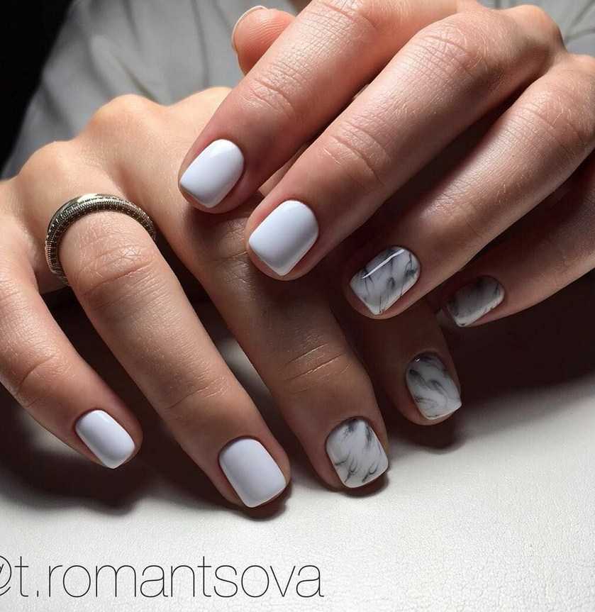Маникюр мрамор прекрасно смотрится на коротких ногтевых пластинах. На фото особенно великолепно выглядят светлые, нюдовые, пастельные оттенки, которые близки к природным текстурам мрамора. Декор лучше применять в небольшом количестве, чтобы не перегрузить дизайн.