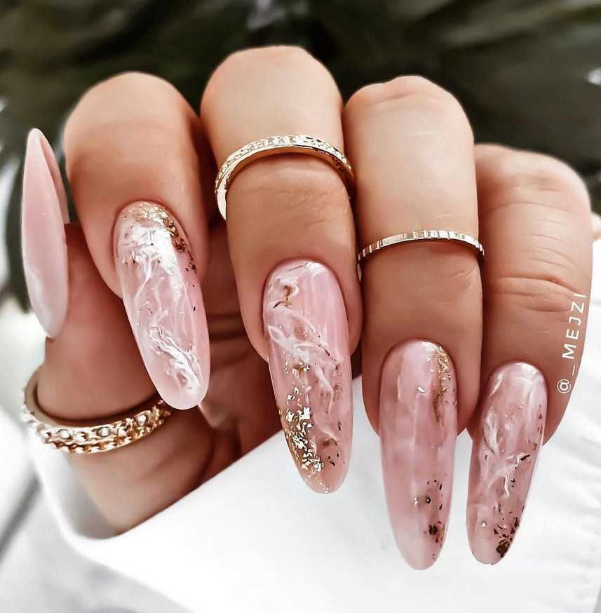 Что касается формы ногтевых пластин, то наиболее актуальным решением в этом случае можно назвать «мягкий» квадрат, овальные или миндалевидные ноготки, которые благодаря плавной линии свободного края максимально подчёркивают изящность мраморных разводов.
