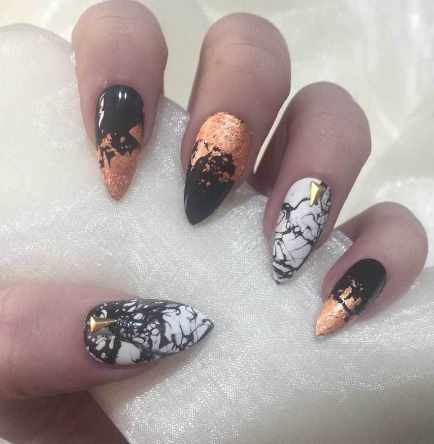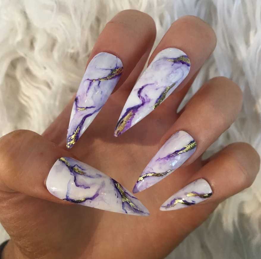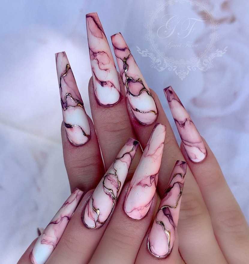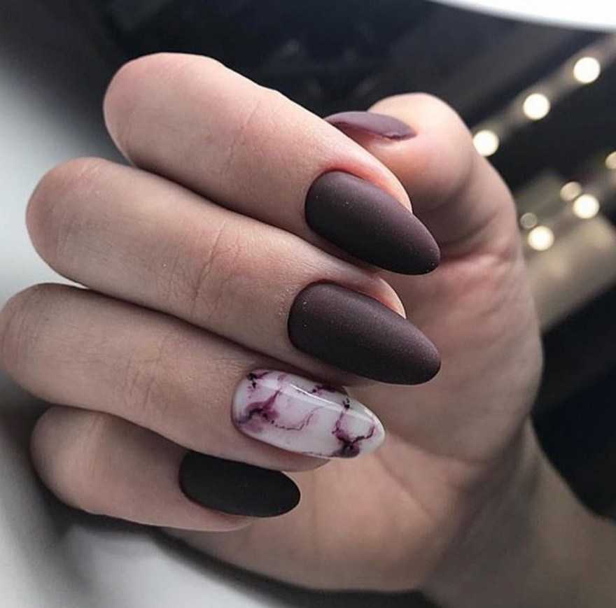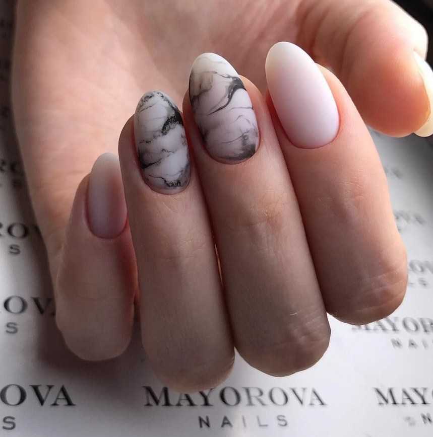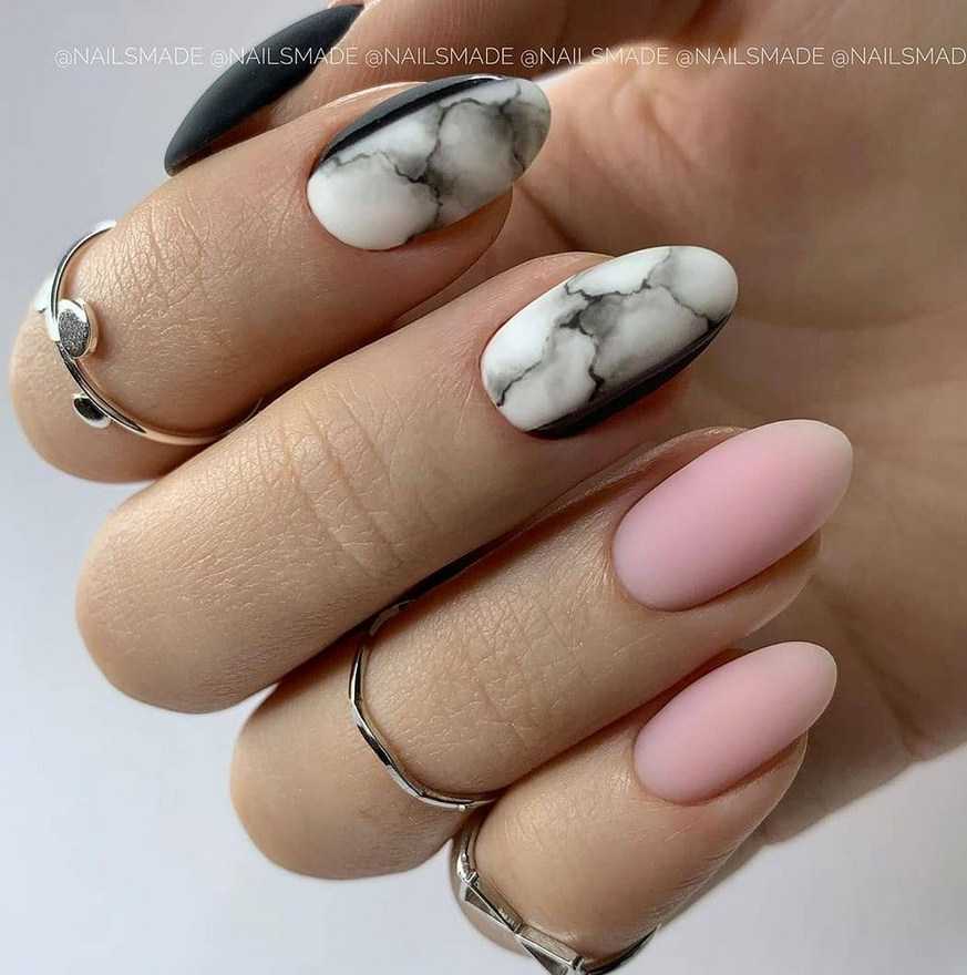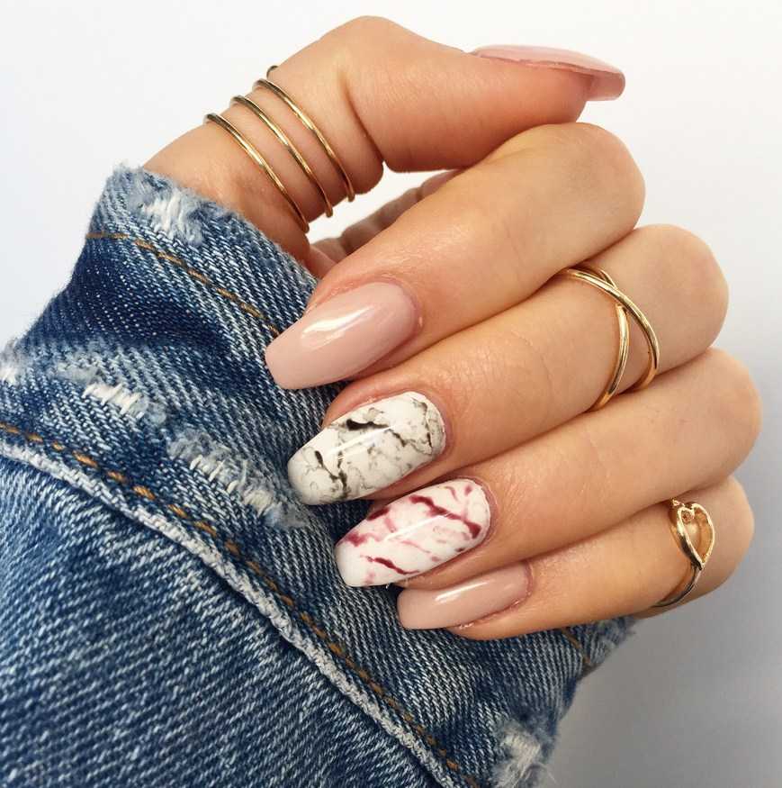 На большой длине эффектно смотрится и контрастный, и нюдовый, и цветной мраморный маникюр. Особенно завораживающе выглядит дизайн с одним оформленным в стиле «marble stone» ноготком и матовой текстурой на остальных.