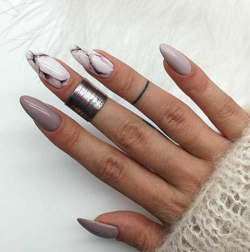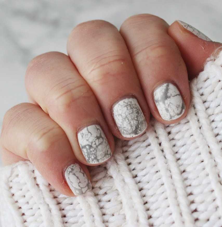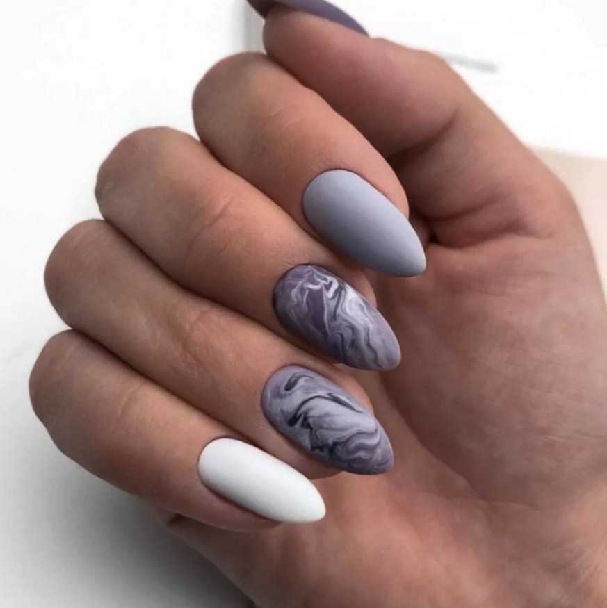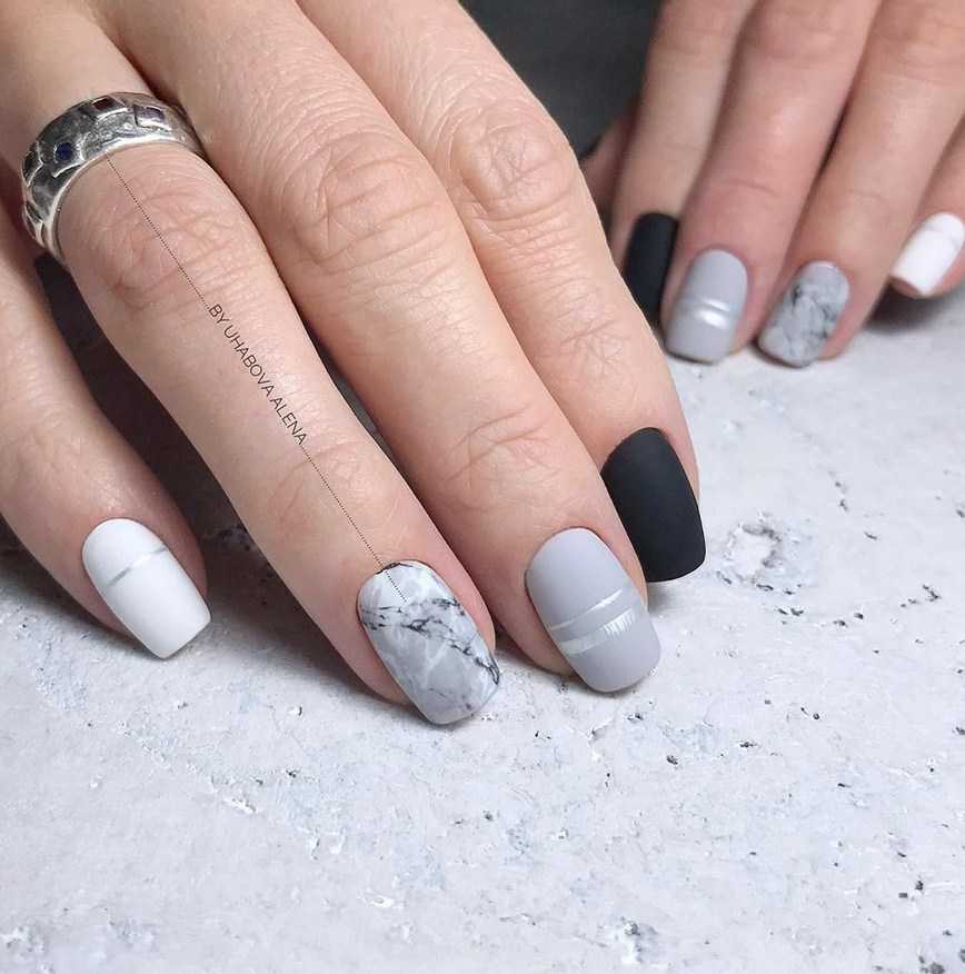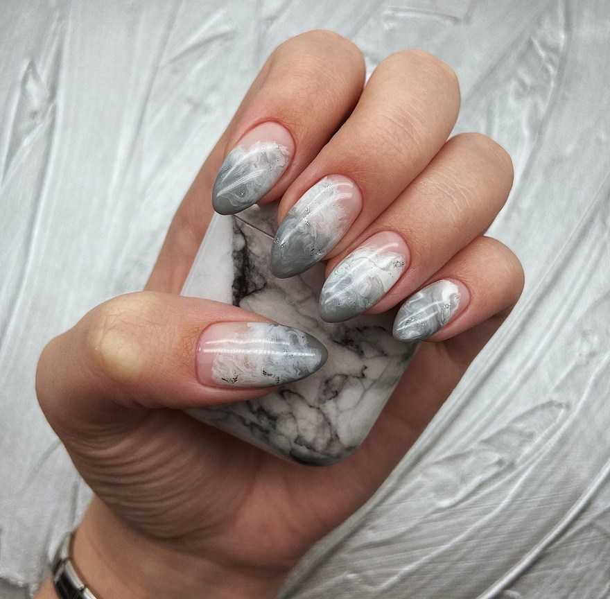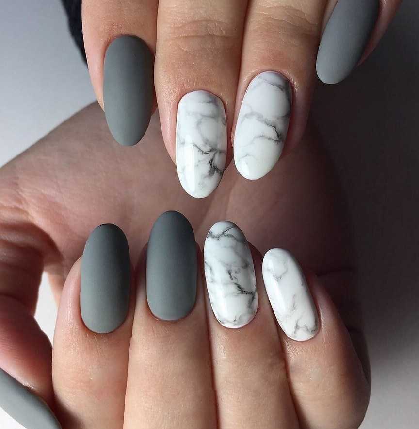 Благодаря тому, что серый входит в список базовых цветов мраморного нейл-дизайна, различные вариации этого маникюра в серых тонах просто не могут смотреться неудачно