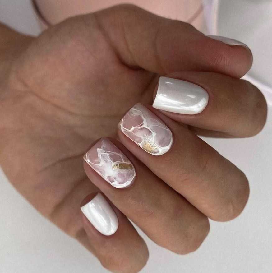 - Но и для работы с легкостью можно использовать белоснежный мраморный маникюр, если есть желание удивить коллег своим сказочно красивым маникюром.