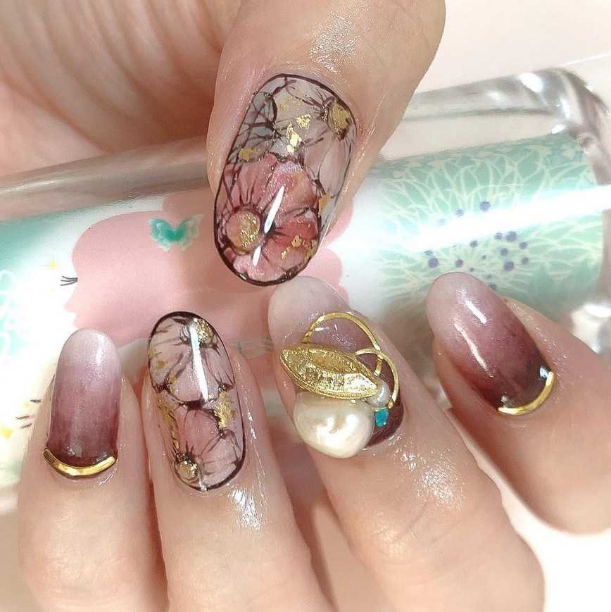 Размытые, полупрозрачные узоры смотрятся нежно и даже мило. Такой маникюр в 2023 году особенно хорошо подходит к миндальной форме, добавляет свежести. В основном на миндалевидной форме акварельные узоры делают в виде: