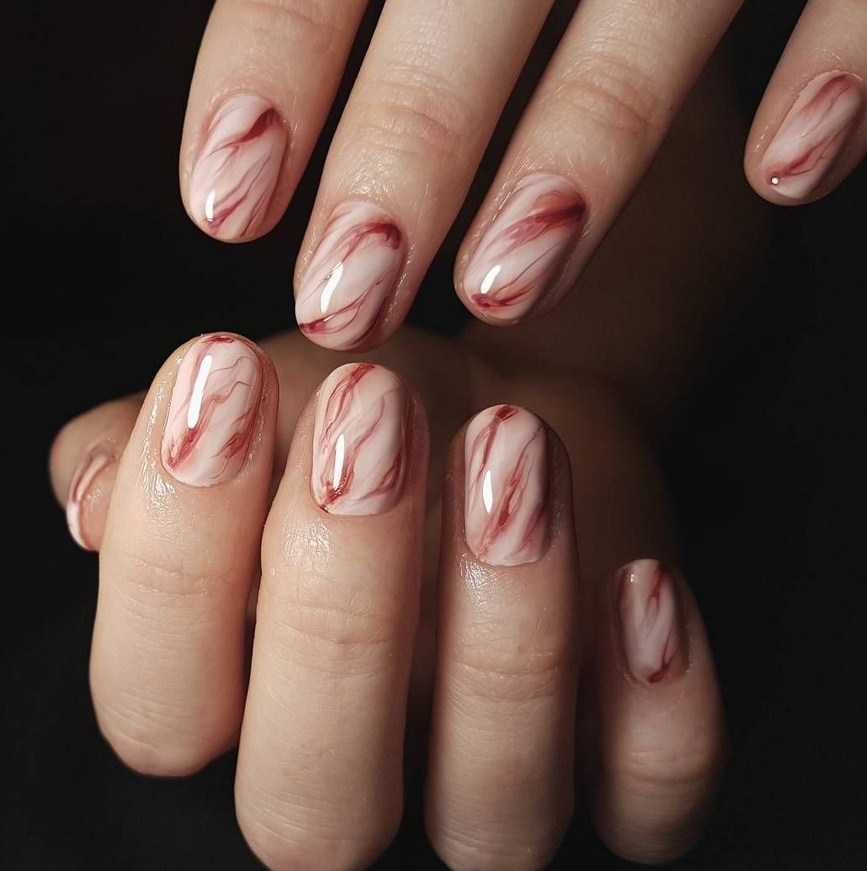 Самое важное — правильно подобрать оттенок красного. Красный мраморный маникюр хорошо сочетается с черным лаком