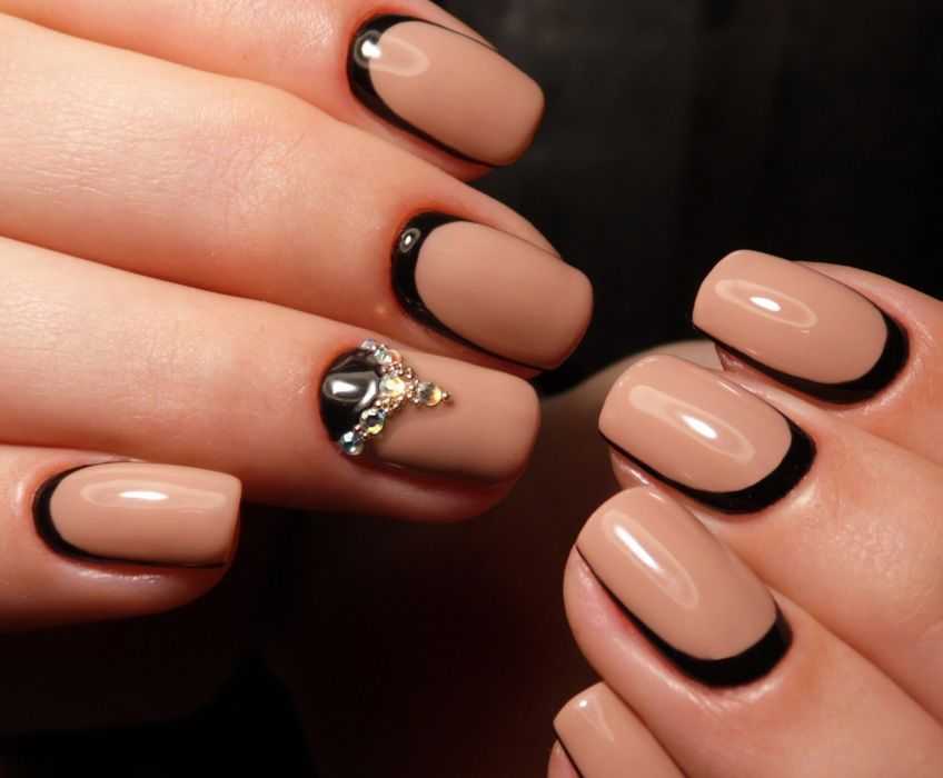 Универсальный фоновый цвет в повседневной носке дополняется матовыми или глянцевыми узорами, геометрическими фигурами спокойных оттенков, флористическими узорами, кружевом. Один или два пальца можно украсить стразами, окантовывающими лунулу.