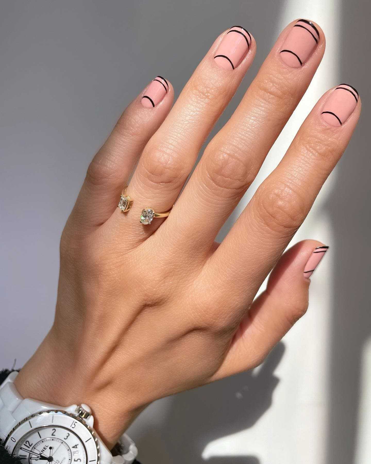 Лавандовый маникюр, графический рисунок черные линии и блестки.