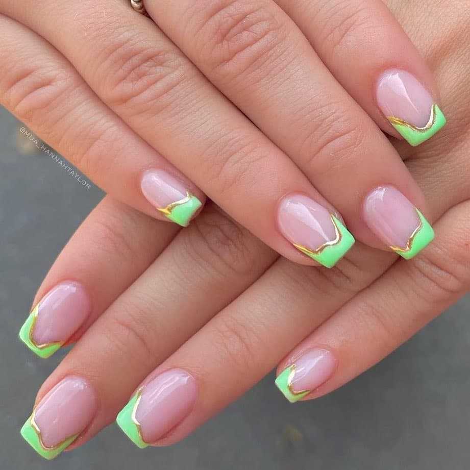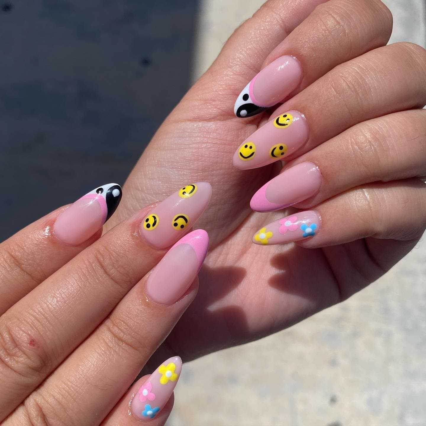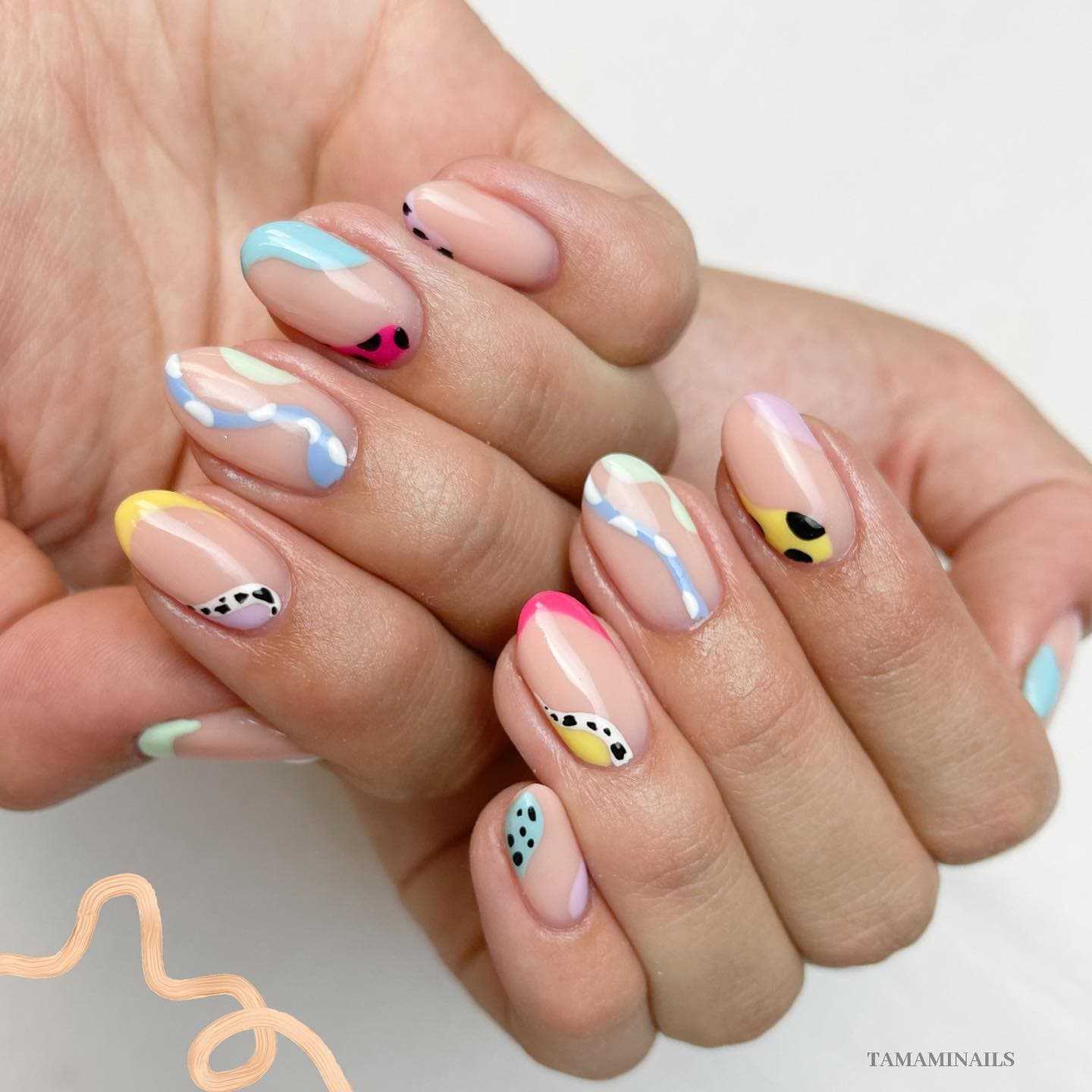 Френч-твист предполагает яркие абстрактные узоры и их переплетения. Здесь ногти должны быть похожи на цветные карамельки. Это еще один отличный маникюр для лета.