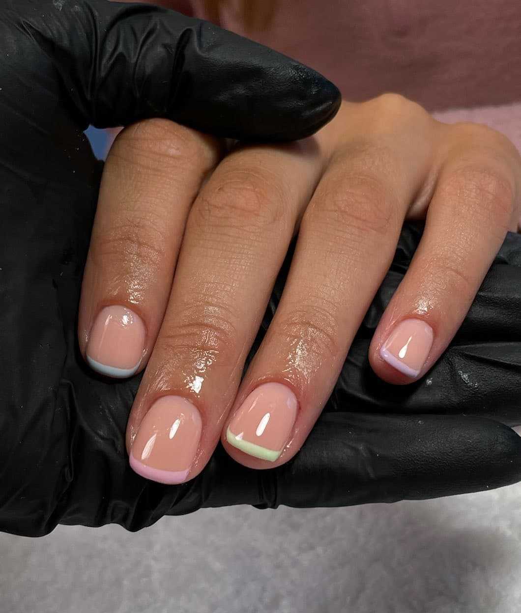 Одна из самых интересных современных тенденций — это разноцветный френч. Это дизайн, когда каждый из ноготков оформляется в свой цвет. Чаще всего такой прием используют летом. Мастера не рекомендуют перегружать такой маникюр другими элементами декора. А для базы стоит выбрать максимально нейтральный оттенок. Например, молочный, нюдовый, любой пастельный. Если хочется добавить декора, рекомендуем выбрать один акцентный палец на руке и нанести на него, например, рисунок стразы.