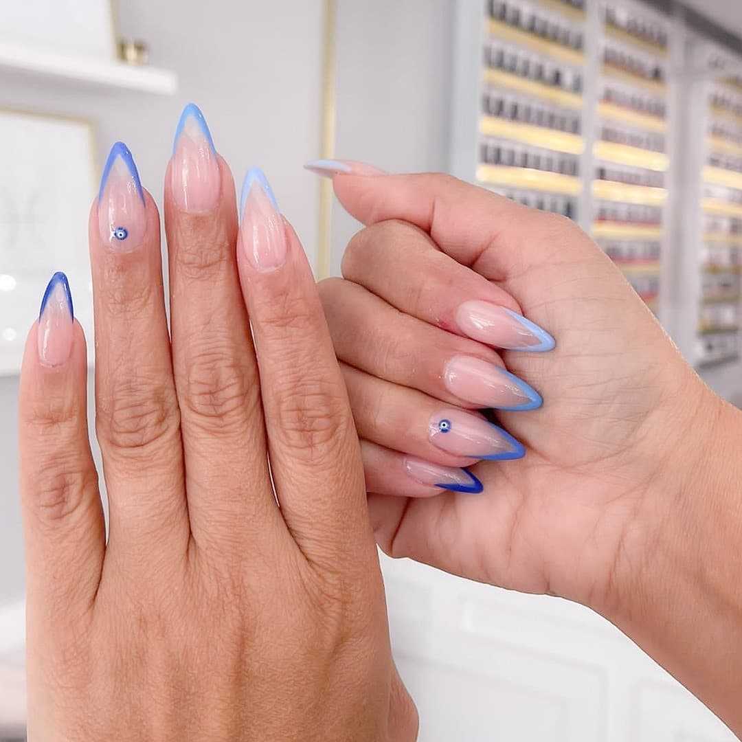 Палитра синего очень богата. От ледяного голубого до практически черного. Вы можете выбрать любой оттенок, все зависит от сезона и уместности маникюра. Например, темно — синий вы можете выбрать на замену черного. А голубой отлично подойдет для создания французского маникюра теплыми летними днями.