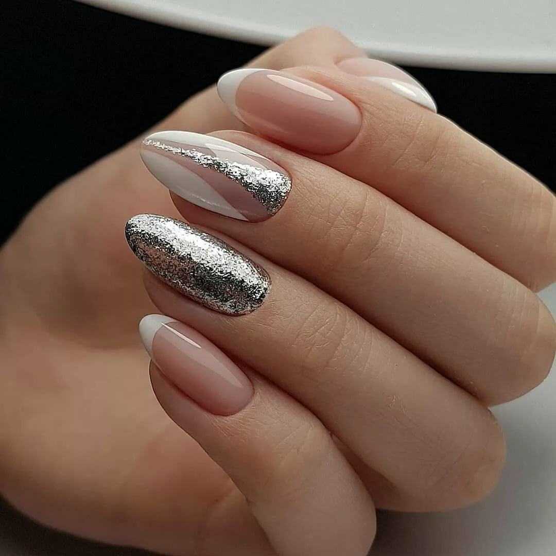 В маникюрном наборе каждой девушки найдется лак с серебряными блестками. Дизайн с глиттером выглядит одновременно стильно и естественно. Такой дизайн одинаково уместно будет выглядеть в офисе и на корпоративе. Самый простой дизайн – это покрыть 1-2 ноготка серебряным глиттером.