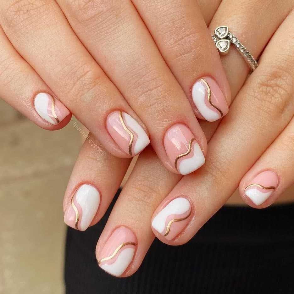 Такой дизайн потребует определенной сноровки или вспомогательных средств. Это может быть обычная клейкая лента для дизайна. Нанесите базовое покрытие, просушите. Теперь приложите ленту в изогнутом виде на воображаемую границу (туда, где бы у вас начинался белый кончик). Белым (или любым другим цветом) окрасьте весь ноготь, и удалите ленту. В итоге вы получите пустую линию.