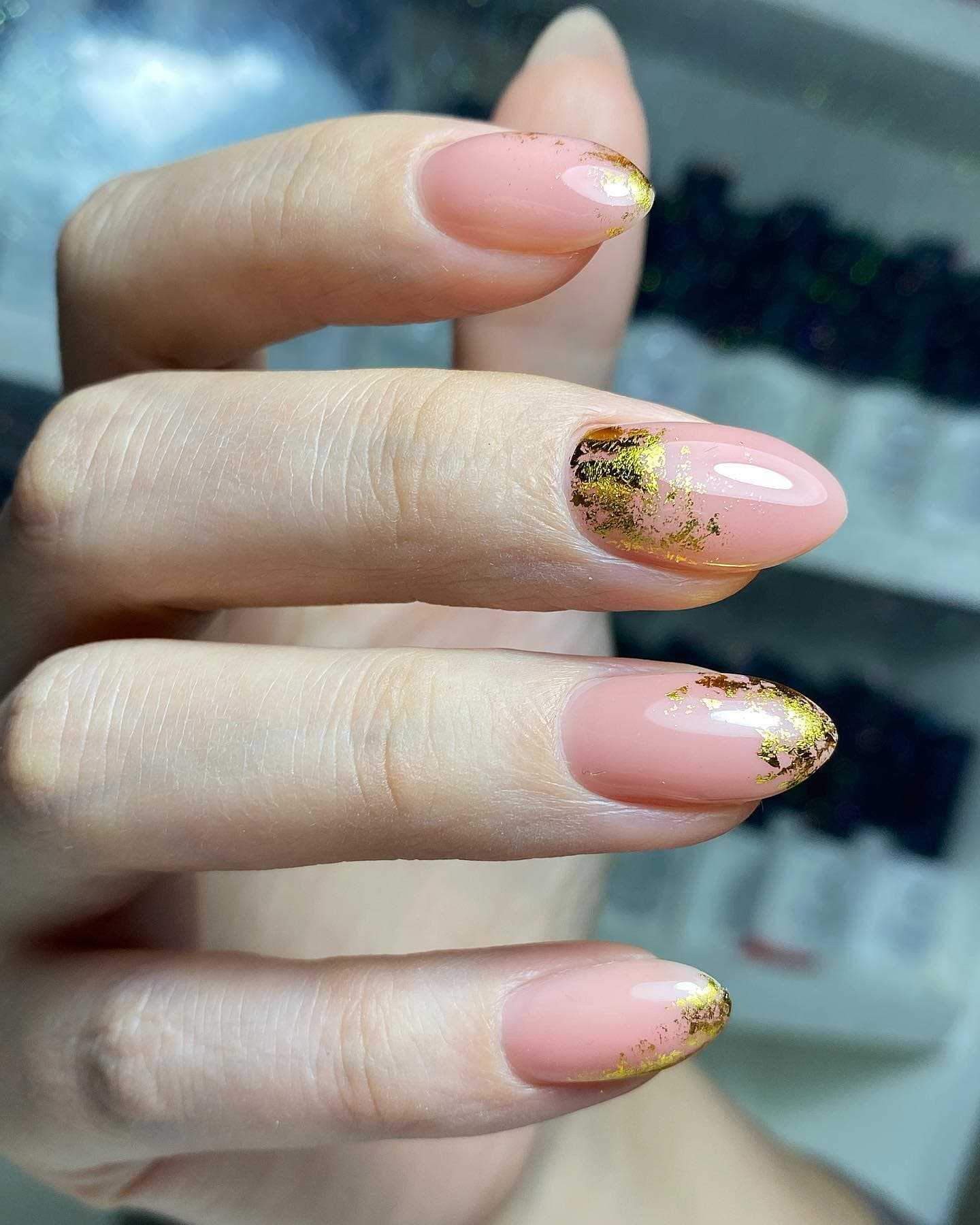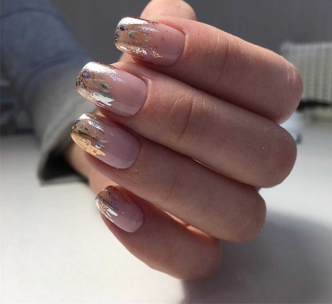 Очень красивый арт френч на ногтях напоминает хлопья патали. Здесь край ногтя кажется украшенным тонкой золотистой фольгой, что выглядит очень необычно и стильно. Такой маникюр идеален для вечерних выходов.