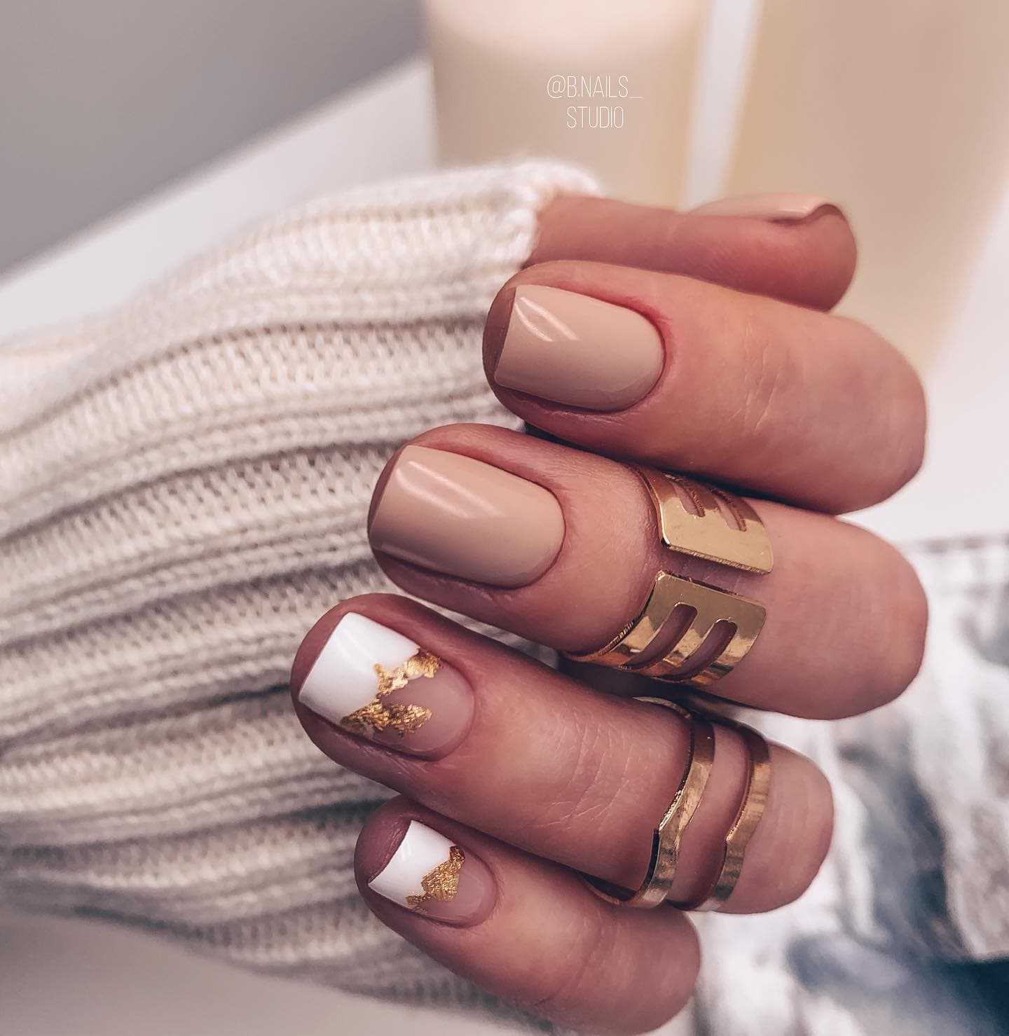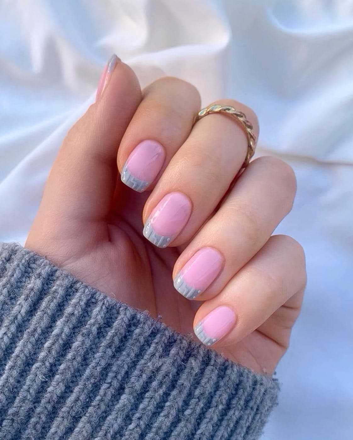 Хотите сделать быстрый праздничный маникюр? Выбирайте френч, только оформите улыбку золотом или серебром. База может быть любой — нейтральный, нюдовой или яркой цветной.