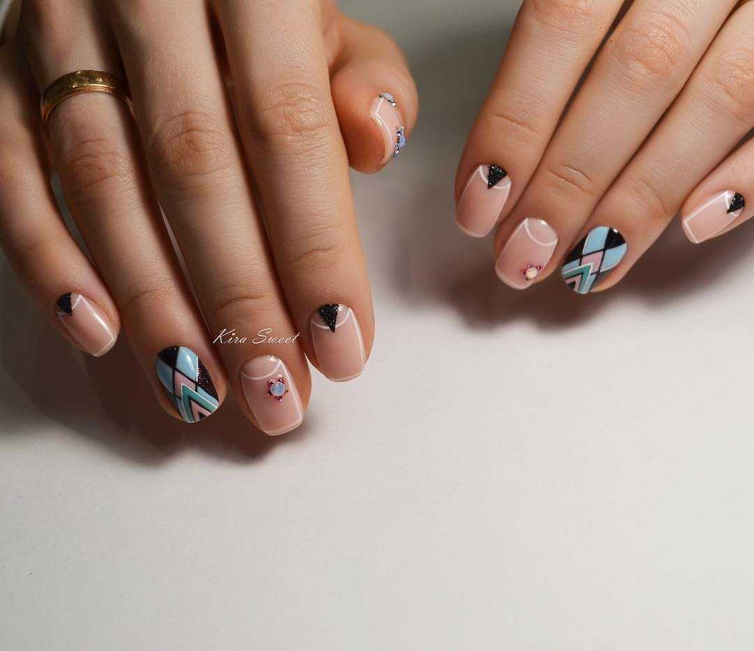 Нюд и лак с блестками. Это самый простой способ добавить немного гламура в ваш образ, особенно, если вы еще новичок. За основу берем любой оттенок нюда, который вам больше всего нравится. Как только основа высохнет, можно наносить лак с блестками. Здесь вы можете сами придумать способ нанесения — можно нанести на кончики ногтей, можно на пластину. А если хочется лаконичного маникюра, то можно нарисовать аккуратные вертикальные или горизонтальные полосы. Вам нужно будет нанести несколько слоев такого лака. Для лучшего эффекта можно нанести и 3 слоя. Если уж вы взялись за узоры, то попробуйте с простых геометрических полос. Как это сделать: