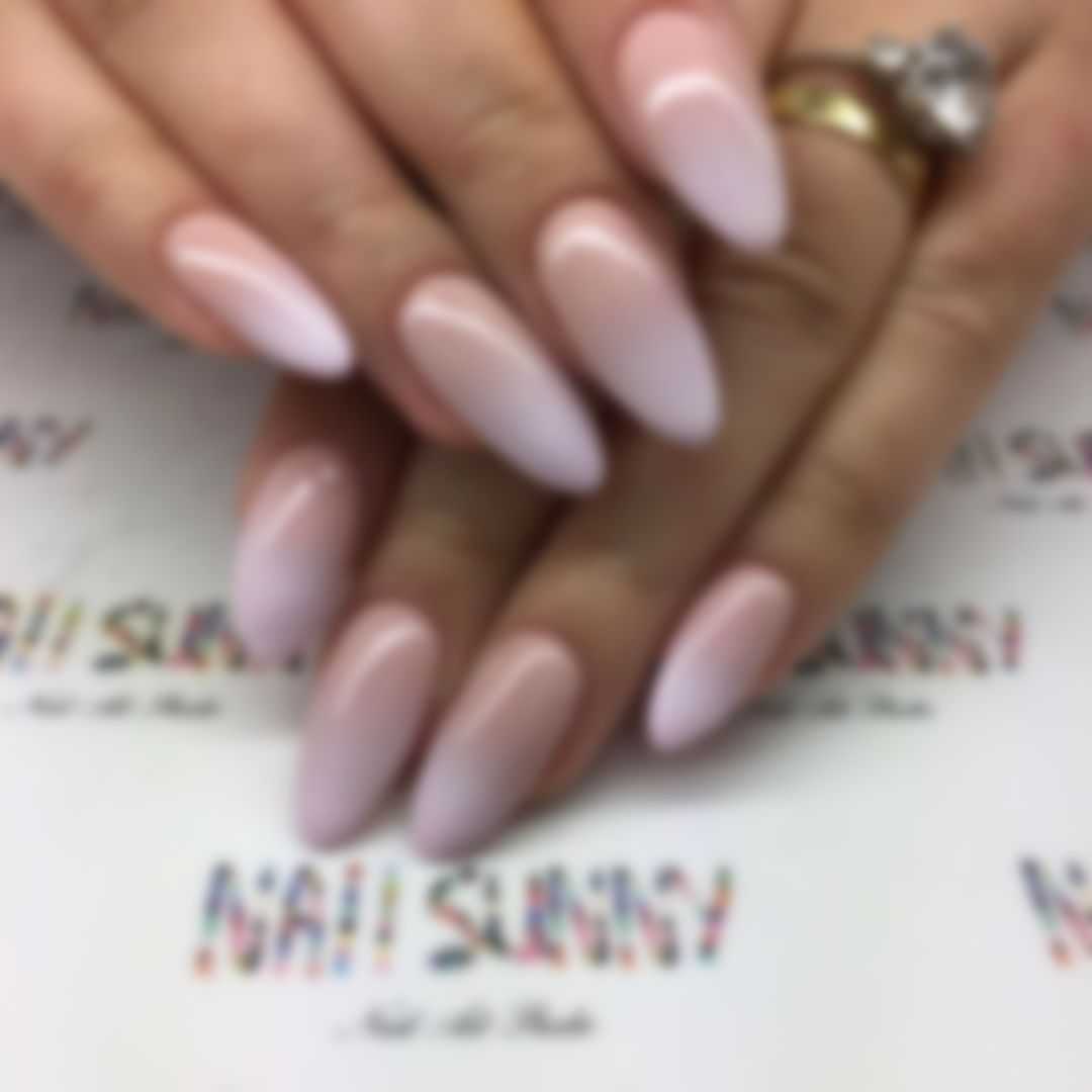 Френч-омбре. Мягкий телесный цвет от лунки ногтя переходит к молочно-белому на кончике. Поэтому он носит наименование нюдовый френч-омбре.
