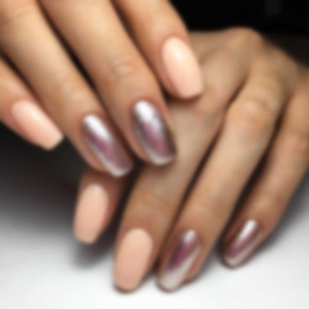 Втирка, то есть использование мелкого блестящего пигмента консистенции пудры. Металлическая зеркальная втирка очень популярна. Но главный закон неумолим: втирка должна быть в тон лаку. Особенно хороша втирка в сочетании с матовым нейл-артом, а применяется она как на одном ноготке, так и сразу на всех.