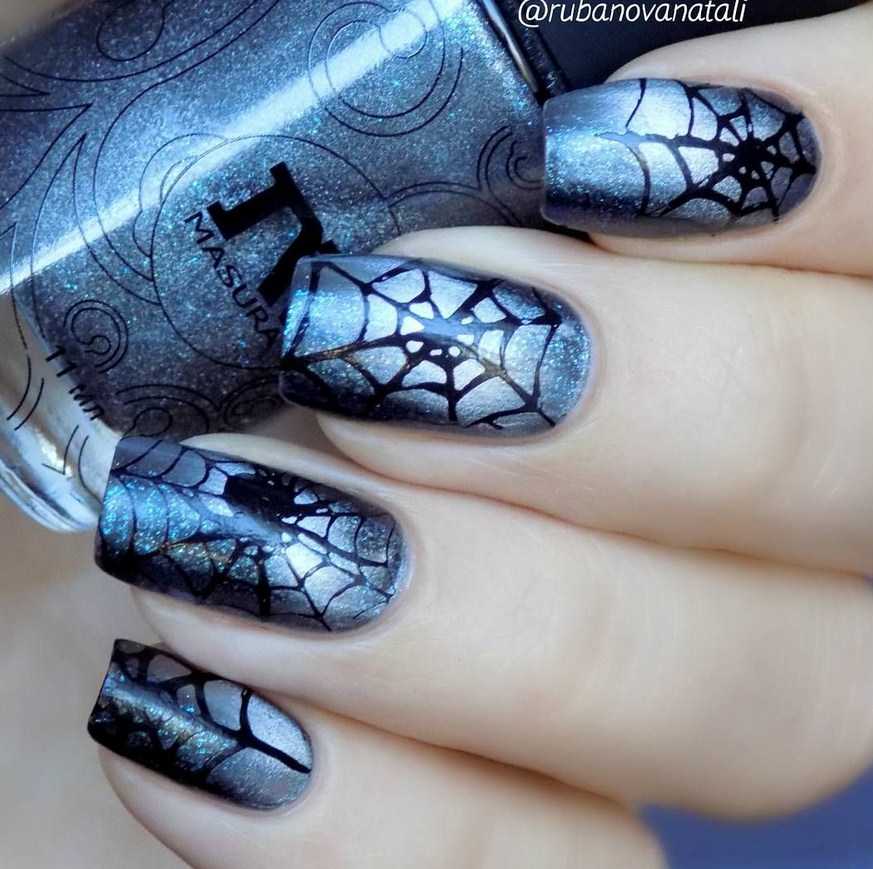 Можно не покрывать всю поверхность ногтя магнитным гель-лаком. Достаточно дополнить отдельную часть пластины рисунками веточек или паутинкой.