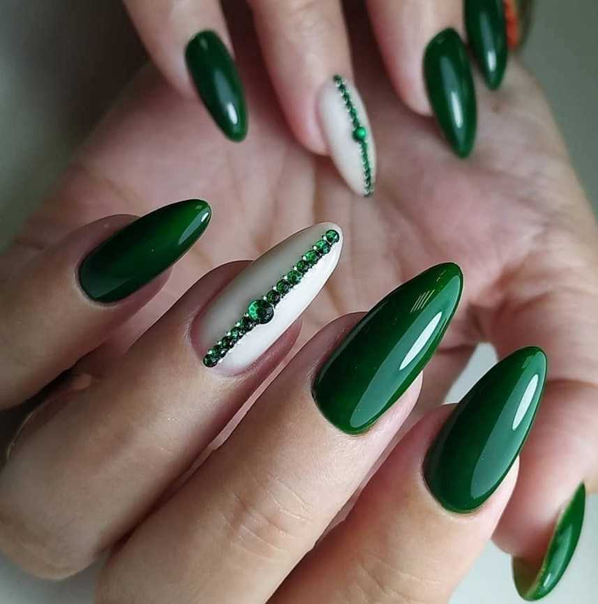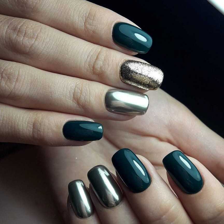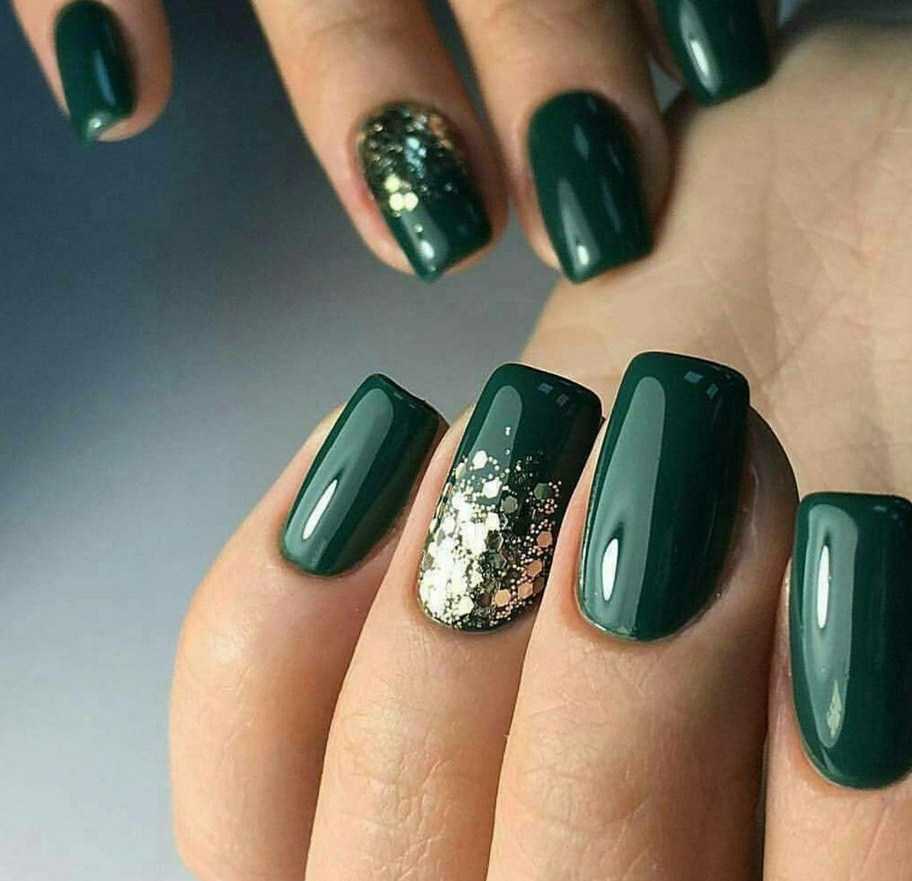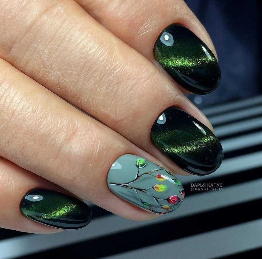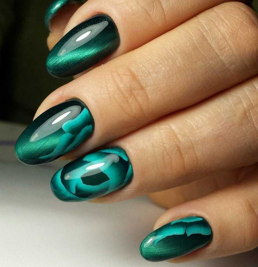 - Маникюр можно создавать с использованием лаков зеленых тонов: малахитовый или болотный эффект.