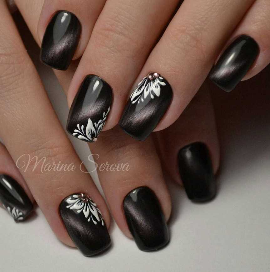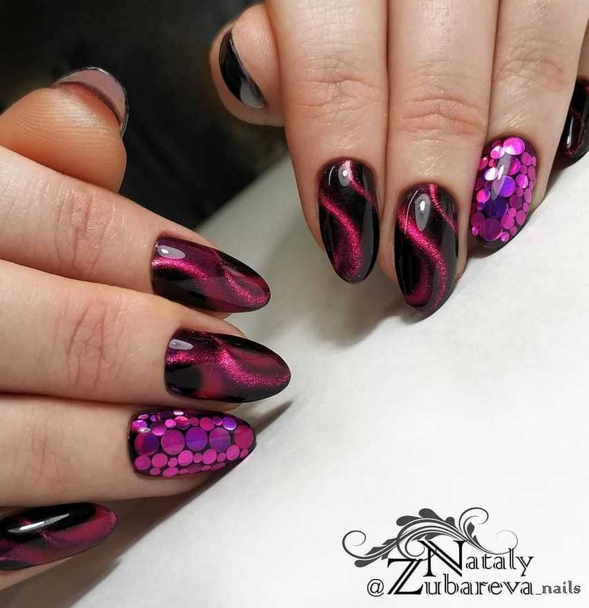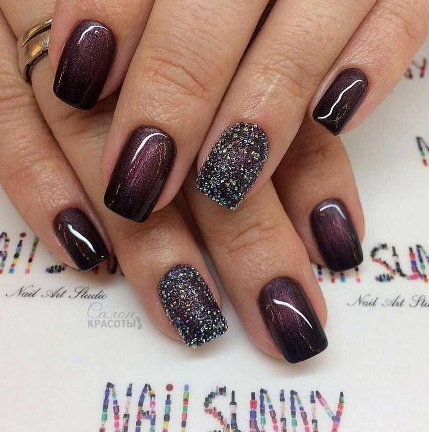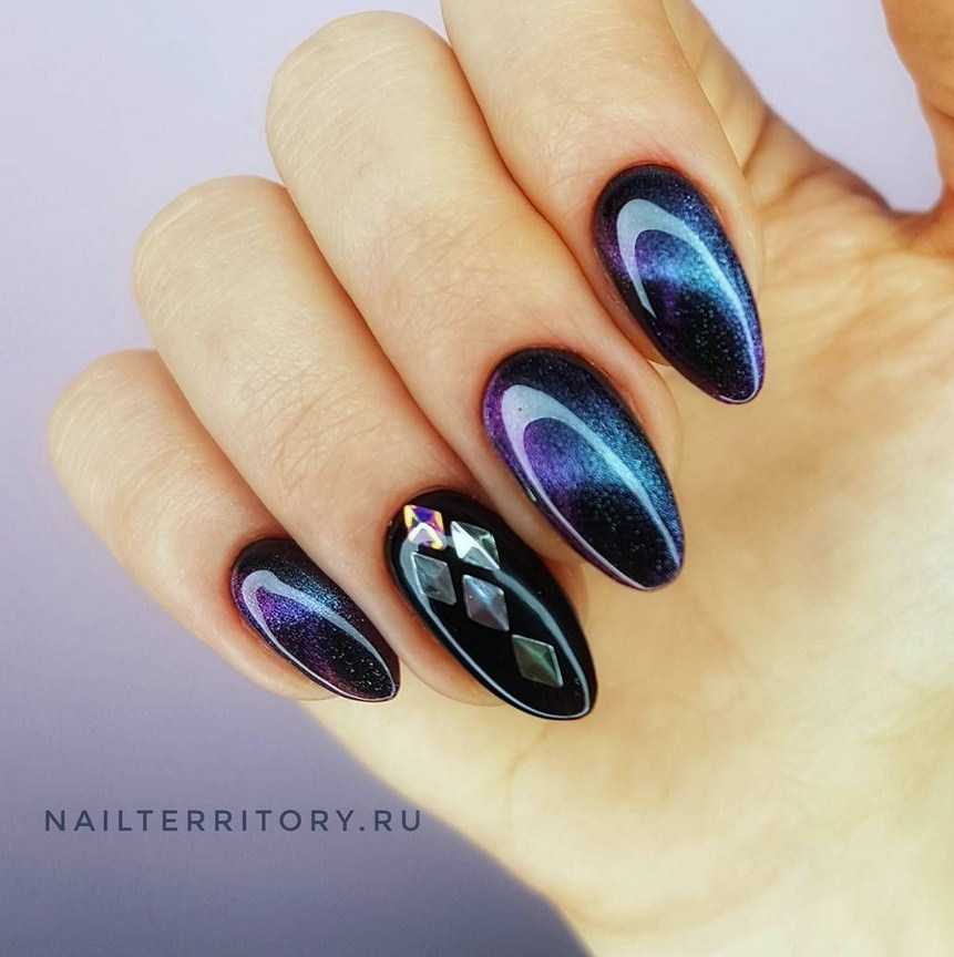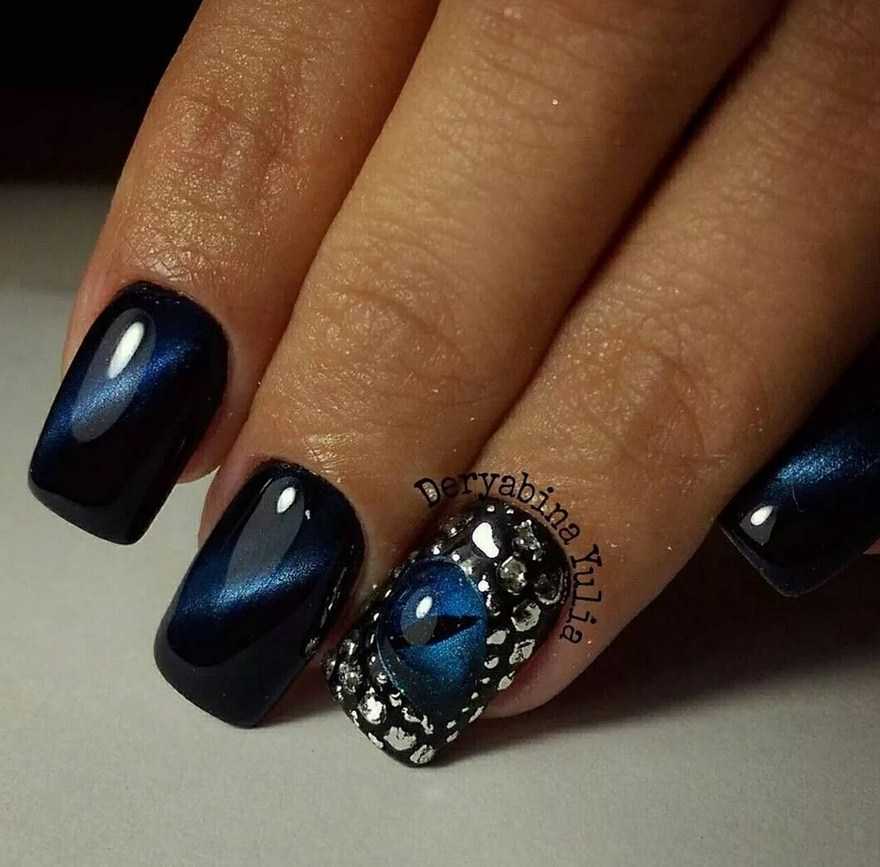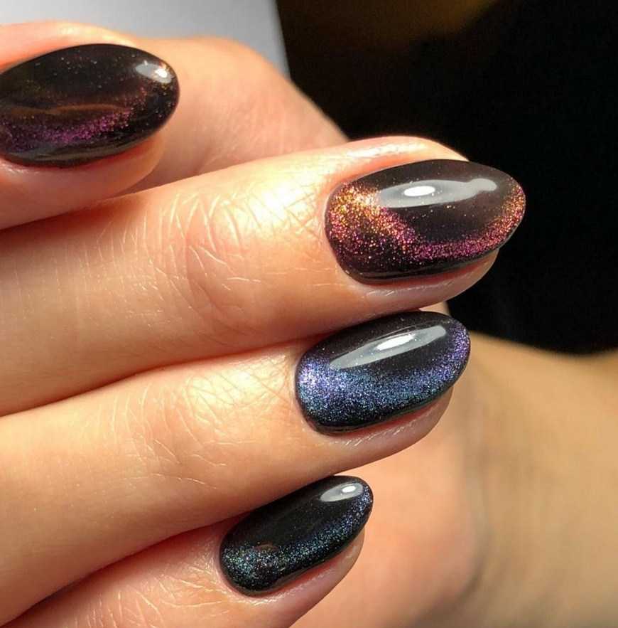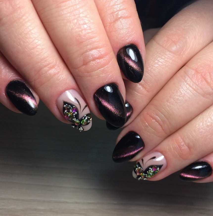 При желании черный маникюр можно украсить миллионами магнитных сверкающих частиц — модно. Здесь дизайн cat eye можно сделать на всех ногтях или выделить несколько. Еще один красивый вариант – «кошачий глаз» наносят лишь на часть ногтя: вдоль, по диагонали или посередине.