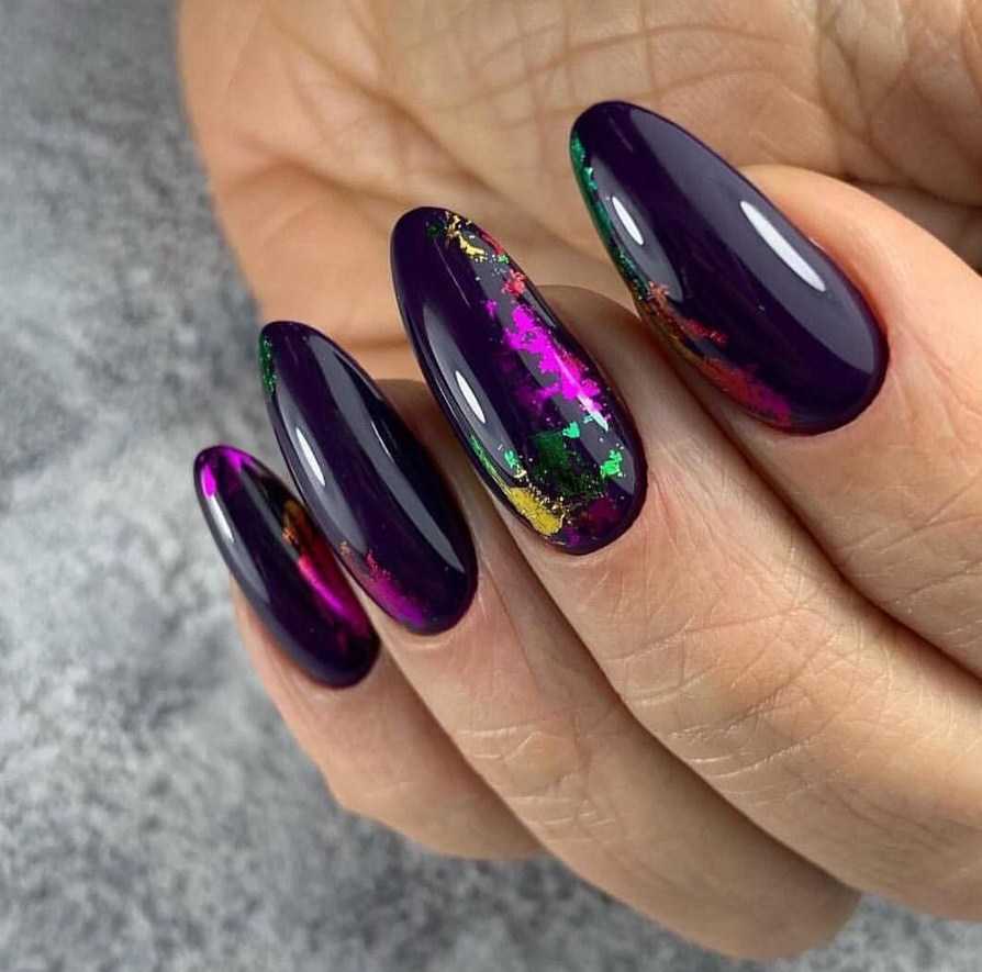 Особой популярностью девушек пользуется техника битое стекло. Для этого ногти покрываются магнитным лаком, акцентируя средний и безымянный пальцы кусочками фольги. Они аккуратно выкладываются в рисунок, напоминающий «витраж» из разбитого стекла.
