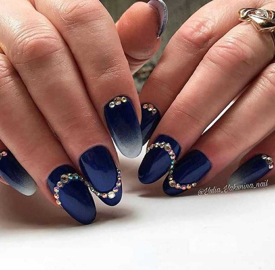 Со стразами. Поклонницы более сложных дизайнов могут использовать разноцветные стразы. Ими желательно украшать один или два пальца. Но не больше. В остальном можете смело экспериментировать. Камни можно выложить в виде хаотичной россыпи, затейливых орнаментов или даже несложных рисунков. Также ими можно задекорировать границы ногтя, зону лунулы или французской улыбки.