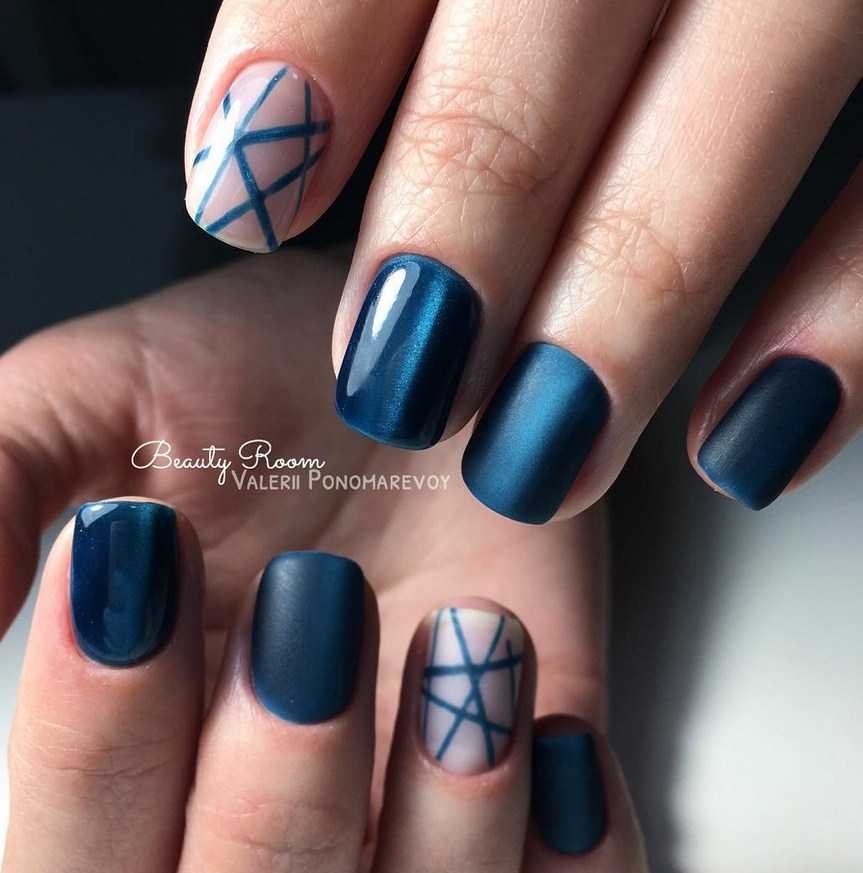 Очень красиво будет выглядеть дизайн, когда на акцентные ноготки наносится кошачий глаз, а на некоторые – матовое покрытие с линиями, прорисованными тем же гель-лаком кошачий глаз.