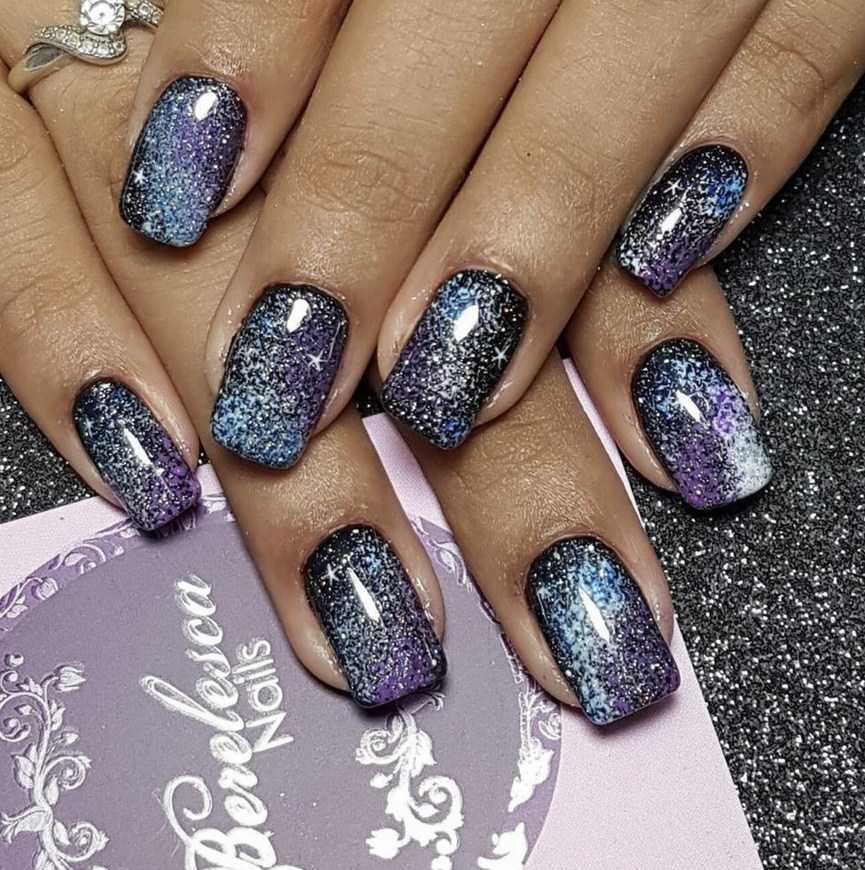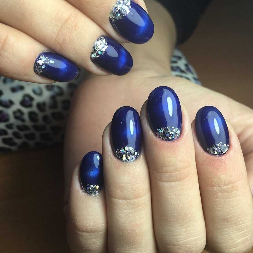 С блестками. Подчеркнуть необычность маникюра кошачий глаз вам помогут мерцающие глиттерные гель-лаки. Ими вы можете просто расставить акценты на уже готовом магнитном покрытии или же украсить полностью весь ноготок. Также цветным глиттером можно выделить зону улыбки, лунулы или и вовсе очертить пластину, тем самым сделав рамку.
