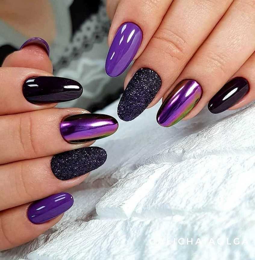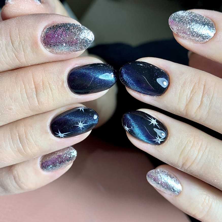 Если в Cat Eye вам кажется недостаточно блеска и переливов, добавьте акцент на каждой пластине глиттером, фольгой или выделите один ноготок на руке блестящим рисунком.