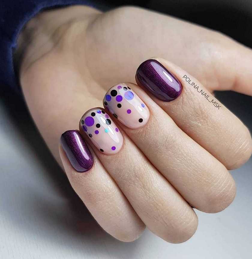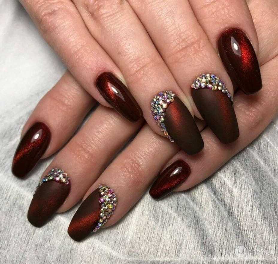 - Внешний вид приобретет мега оригинальность. Большую привлекательность придадут ноготки с матовым покрытием, когда на них добавлен в заключении глянец капельками.