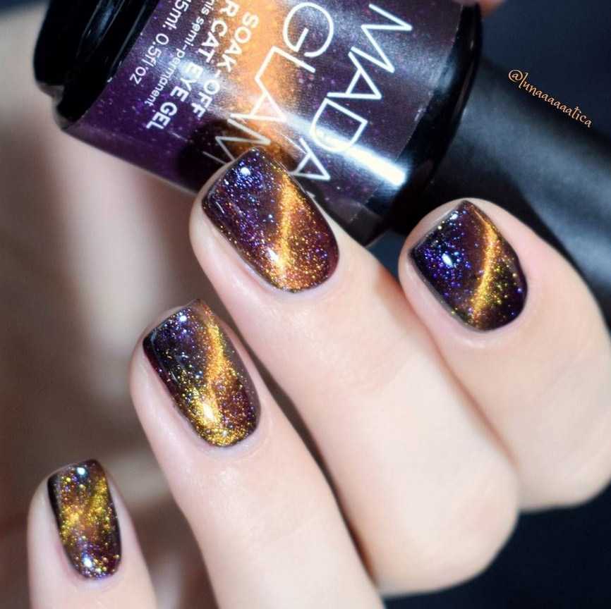 За счет магнитного состава в лаке, эффект кошачьего глаза создаётся сразу после нанесения средства на ноготок. Хотя данный вид дизайна интересен сам по себе даже без украшений, для создания оригинальных идей воспользуйтесь дополнительными средствами декора, которые предлагает современная нейл индустрия.