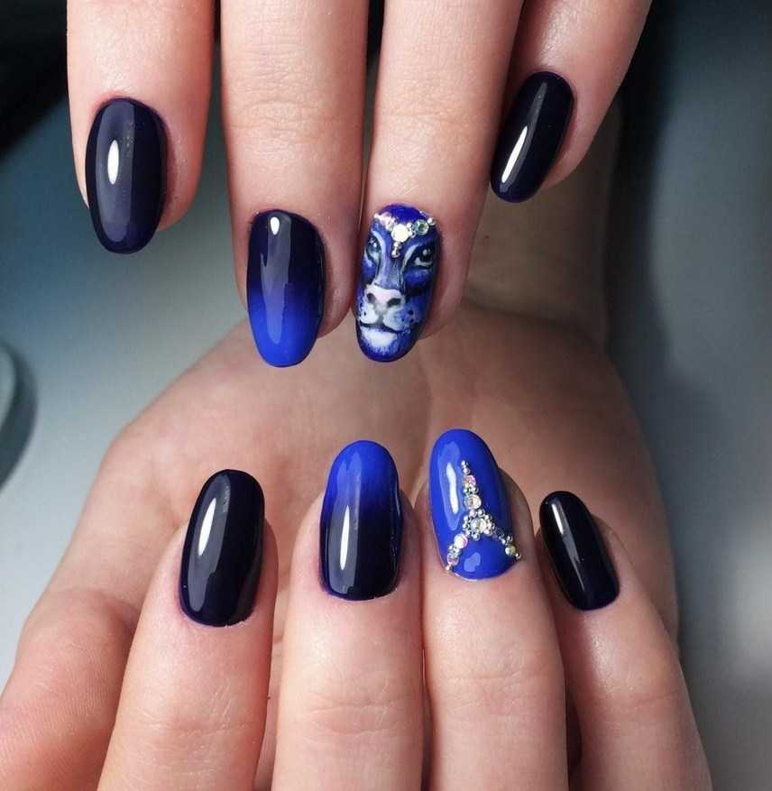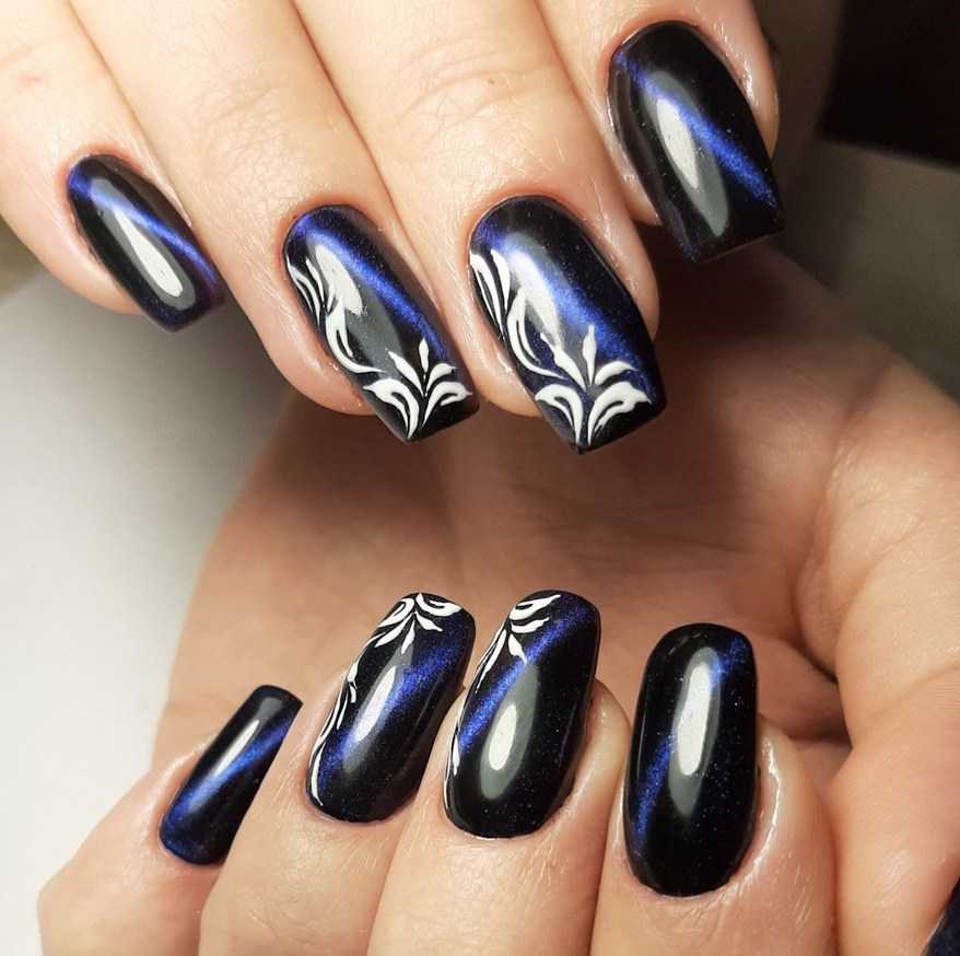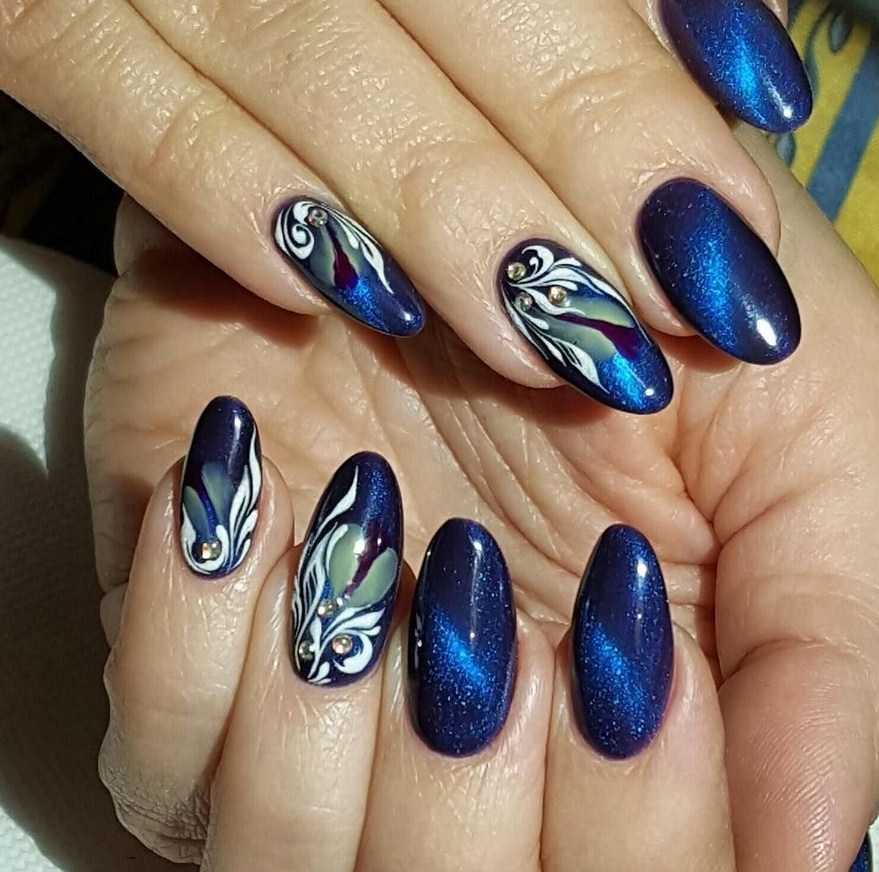 Можно комбинировать с кошачьим глазом художественную роспись. На синей поверхности ноготка красиво выглядят бархатные орнаменты, которые напоминают морозные узоры.