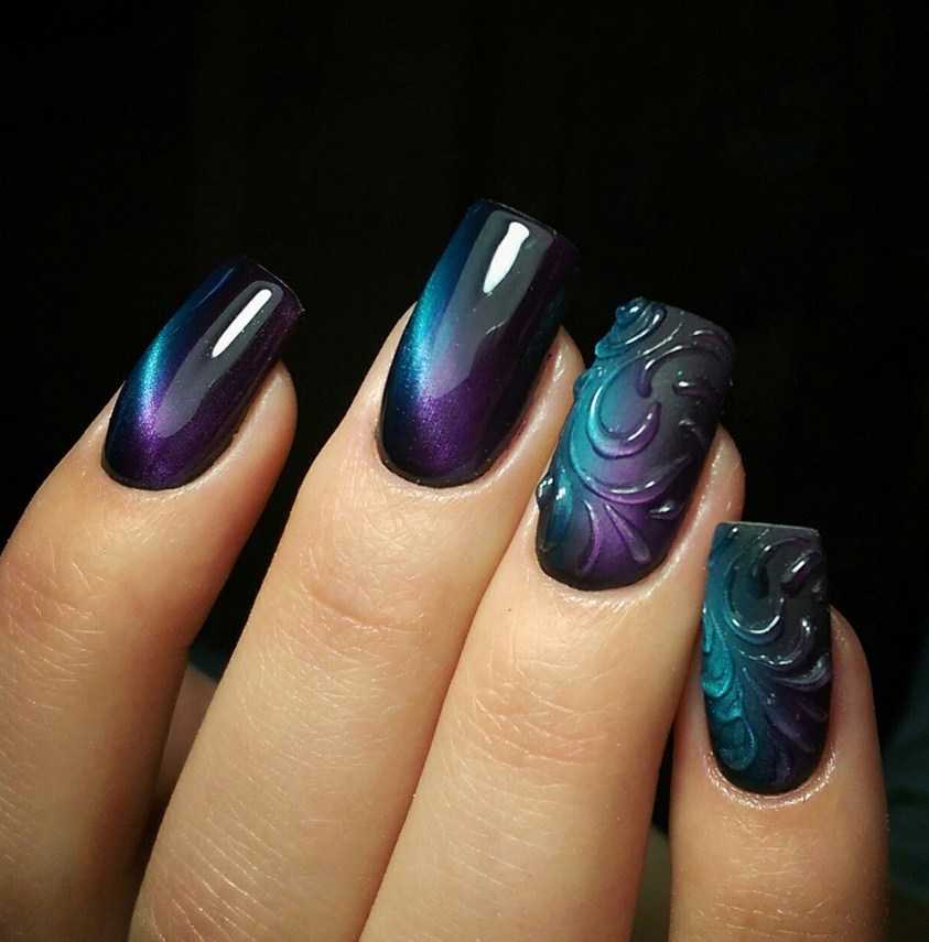 «Кошачий глаз» отлично выглядит в тандеме с различными рисунками, начиная классическими вензелями и завитушками, заканчивая анималистическим принтом или объемным павлиньим пером. Летом подойдут рисунки цветов, а зимой – волшебные снежинки.